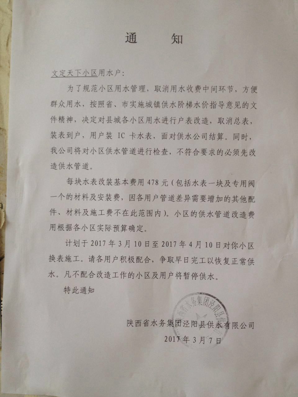 你好,涇陽供水公司在我們小區(qū)(西咸新區(qū)涇河新城先鋒大街文定天下小區(qū))貼出通知說要進行水表改造,要收費478元和其他供水管道改造費等。