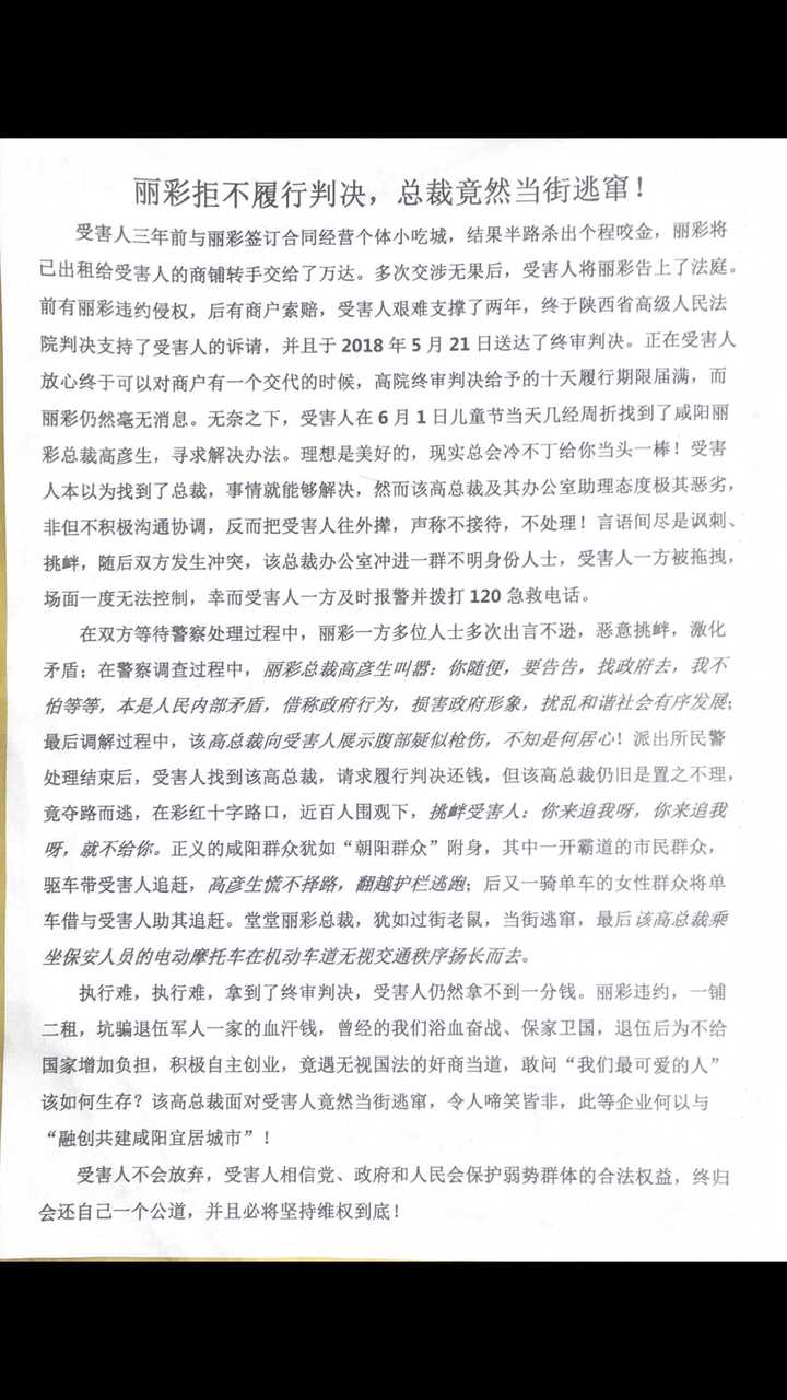 我丈夫是退役軍人,自主創(chuàng)業(yè)這么多年一直本著為國家出力,為陜西出力,為秦商精神服務(wù)的目標(biāo)!請組織能夠嚴(yán)查,咸陽政府內(nèi)部是否如麗彩集團(tuán)所說,有為其撐腰的保護(hù)傘?
