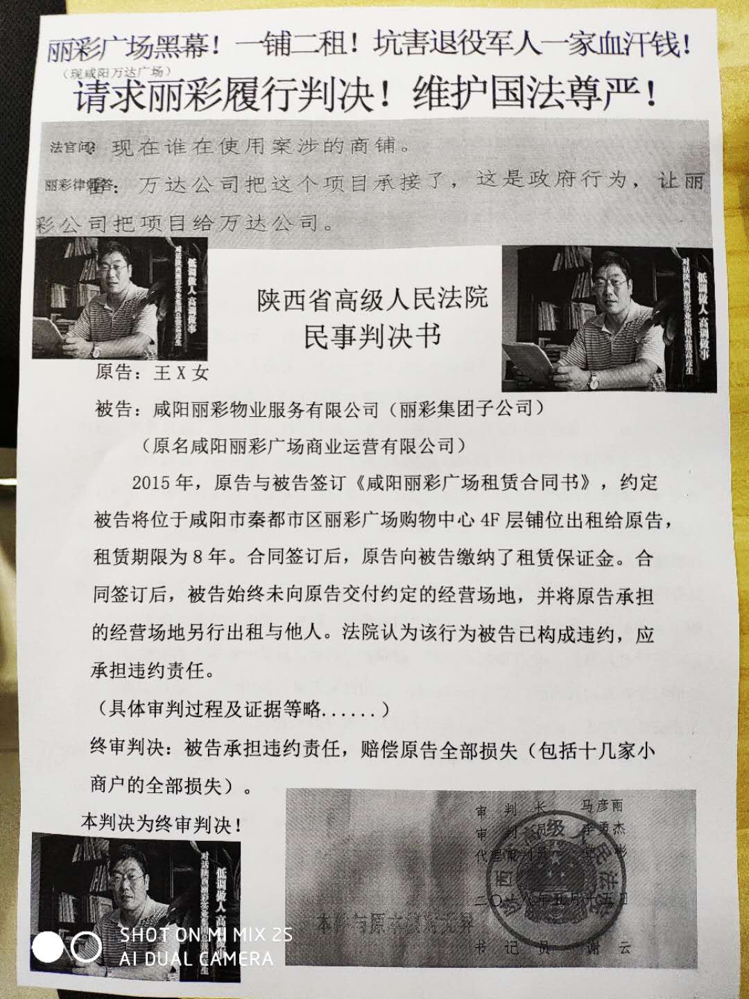 “這起案子打了2年多,導(dǎo)致我原本在西安經(jīng)營良好的小吃城被迫倒閉,為了歸還欠債,借了不少錢,官司雖然勝訴了,但麗彩公司卻一分錢不給,希望執(zhí)法部門能秉公執(zhí)法,共同維護(hù)一個(gè)老百姓的合法權(quán)益。”對于未履行法院判決的原因,麗彩公司至今也未做任何解釋。麗彩公司這次組鋪毀約不僅僅是個(gè)例,據(jù)了解,咸陽市的很多老百姓也對麗彩公司“怨聲載道”,推遲交房、私下拆遷開發(fā)、政府為其“撐腰”等,“不為人知”的事。在全省努力打造良好營商環(huán)境的今天,希望更多的人能夠勇于這種“坑害百姓”、有著“強(qiáng)力保護(hù)傘”的企業(yè)做斗爭;政府和有關(guān)部門還老百姓一個(gè)公道;給市場一個(gè)更開放、更透明的環(huán)境。