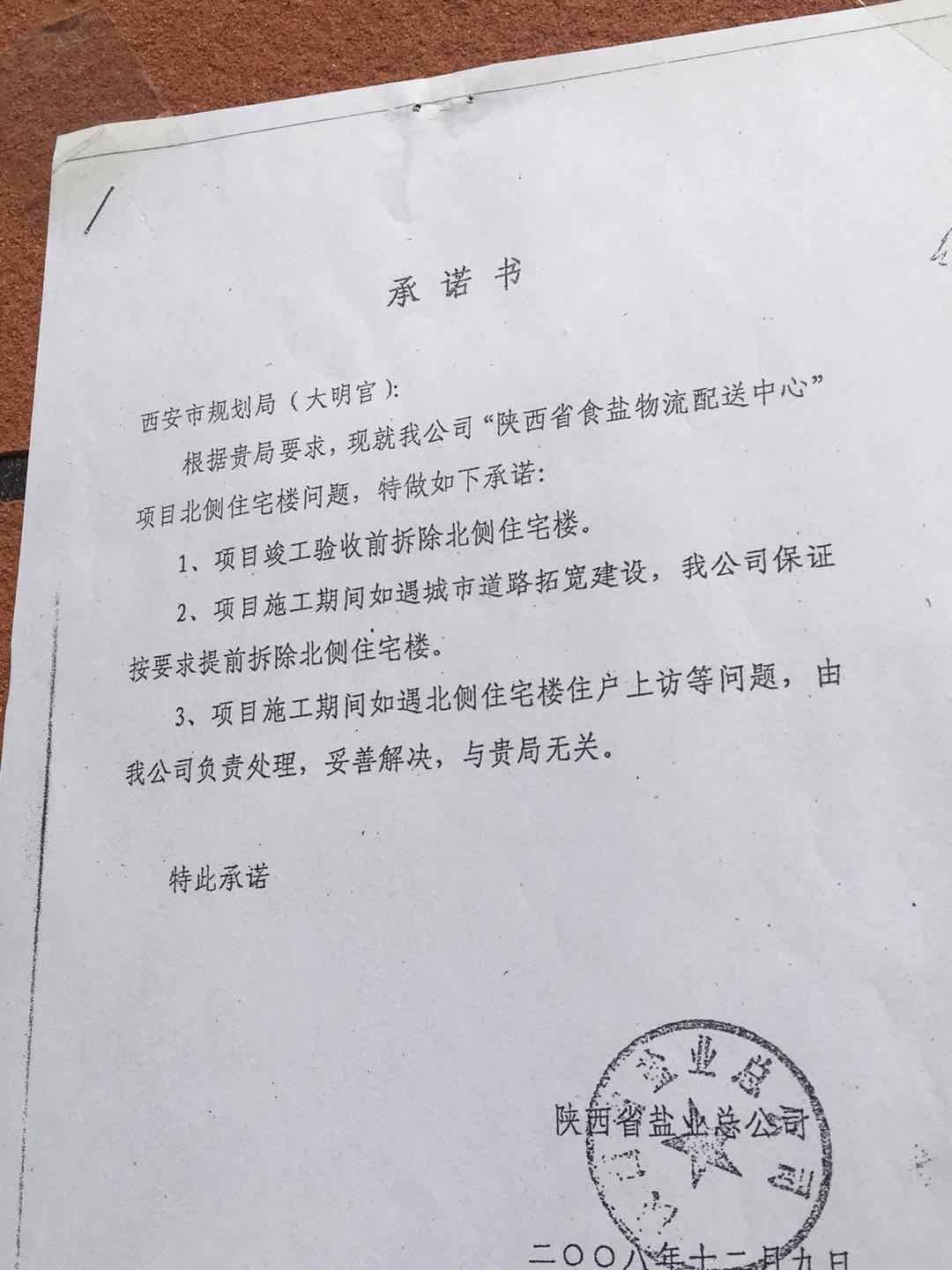 2008年,陜西省鹽業(yè)總公司曾向西安市規(guī)劃局大明宮分局作出過(guò)“小區(qū)項(xiàng)目竣工驗(yàn)收前拆除皇城九號(hào)鹽務(wù)花園北側(cè)住宅樓”的承諾。2015年陜西省鹽業(yè)專營(yíng)公司和陜西歐瑞達(dá)房地產(chǎn)開發(fā)有限公司簽訂協(xié)議,并再次作出“小區(qū)項(xiàng)目竣工驗(yàn)收前拆除皇城九號(hào)鹽務(wù)花園北側(cè)住宅樓”的承諾。但至今未履行舊住宅樓拆除承諾,導(dǎo)致進(jìn)入小區(qū)的市政規(guī)劃路不足4米,無(wú)法滿足消防驗(yàn)收,現(xiàn)小區(qū)上百戶業(yè)主已收房裝修,部分業(yè)主已入住,但因鹽務(wù)局不履行拆遷承諾造成小區(qū)無(wú)法接市政水、電、氣,消防通道寬度不夠,經(jīng)常停水停電,業(yè)主苦不堪言,而且一旦發(fā)生火災(zāi)無(wú)法及時(shí)撲救將造成重大人員傷亡。