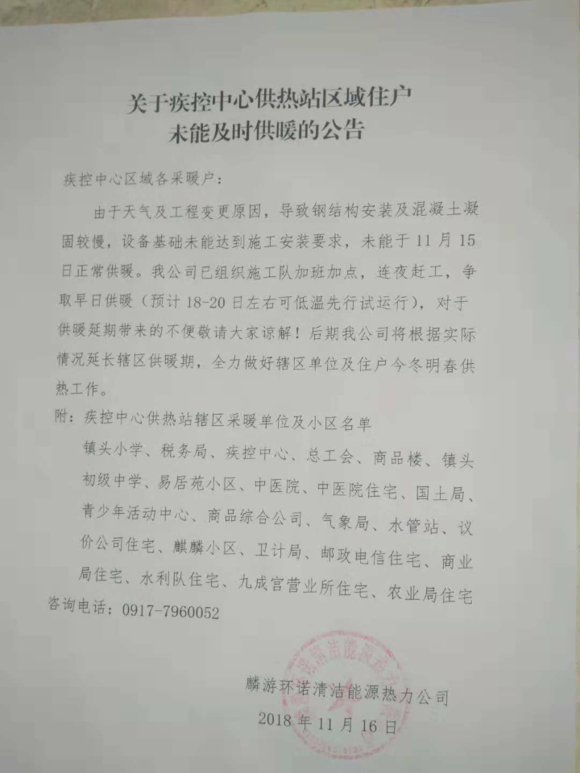 麟游縣冬季供暖問題, 說好的11月15日供暖,沒有按時(shí)供暖,可是今天已經(jīng)19號(hào)了還是沒有,要說馬上試運(yùn)行的話就別說了,為什么不早點(diǎn)施工,你們不知道麟游每年的都冷得比較早嘛?而且16號(hào)麟游環(huán)諾清潔能源熱力公司貼出通知又說18-20號(hào)才開始低溫運(yùn)行,這樣一而再再而三的推遲供暖什么意思,要不退錢吧。