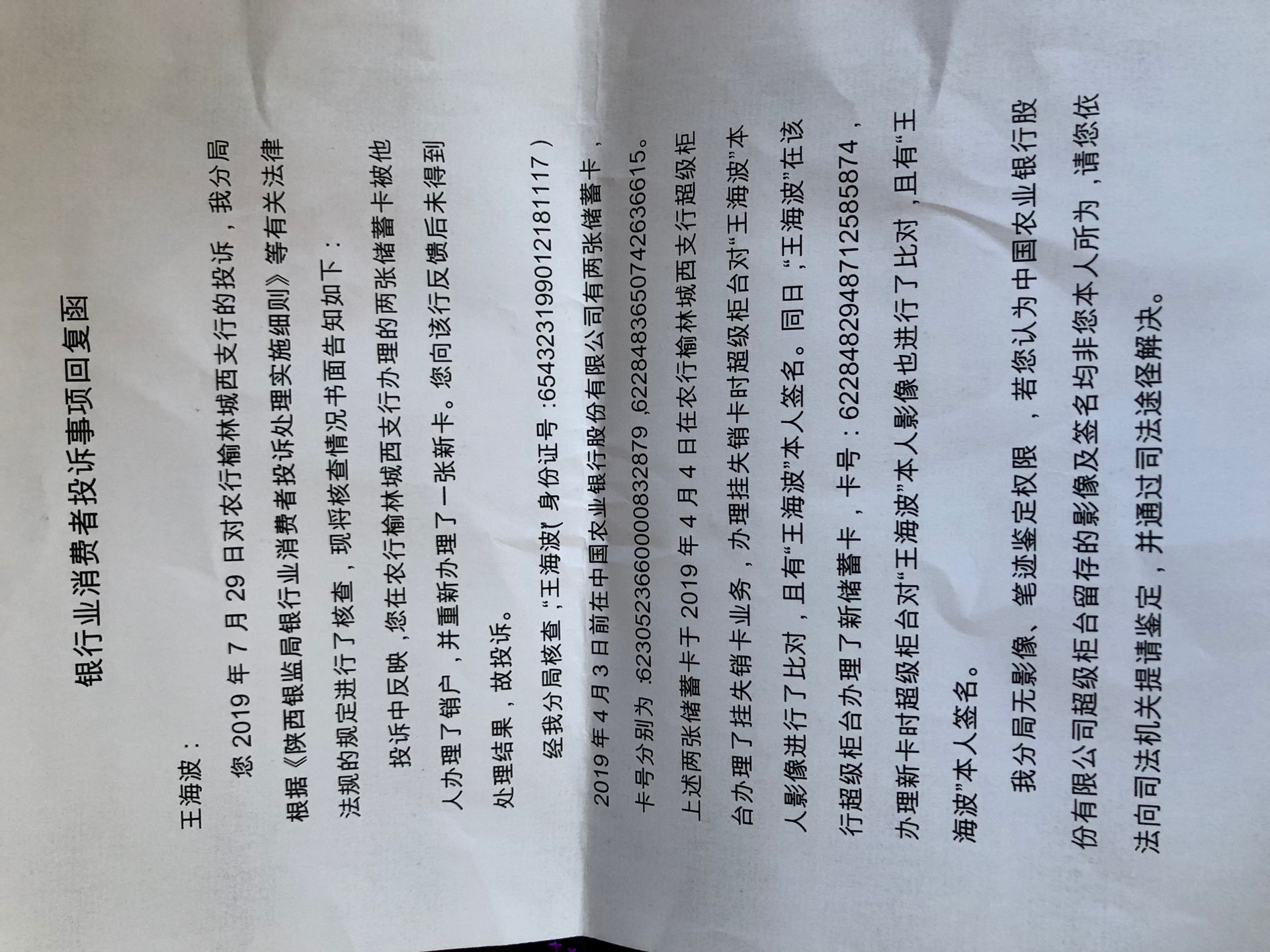 我回到家我就撥打95599客服電話投訴了這個(gè)事,第三天榆林市城西支行經(jīng)理就給我打電話核實(shí)這個(gè)事,我就告訴她不是我本人辦的,她說(shuō)讓我去他們支行一趟核實(shí)下情況。我就把手里的工作安排完,7月18號(hào)我就去了榆林。19號(hào)早上我就來(lái)到了這個(gè)城西支行,那個(gè)經(jīng)理帶我去了他們領(lǐng)導(dǎo)辦公室拿著我的身份證核對(duì),因?yàn)楫?dāng)時(shí)辦卡的那張身份證是2016年辦的,2017年12月我在鄭州丟失,他們核對(duì)完之后說(shuō)辦卡這個(gè)人和我長(zhǎng)的很像,我就說(shuō)不能因?yàn)橄窬桶盐业目ㄗN,還在你們行從新開(kāi)的新戶。