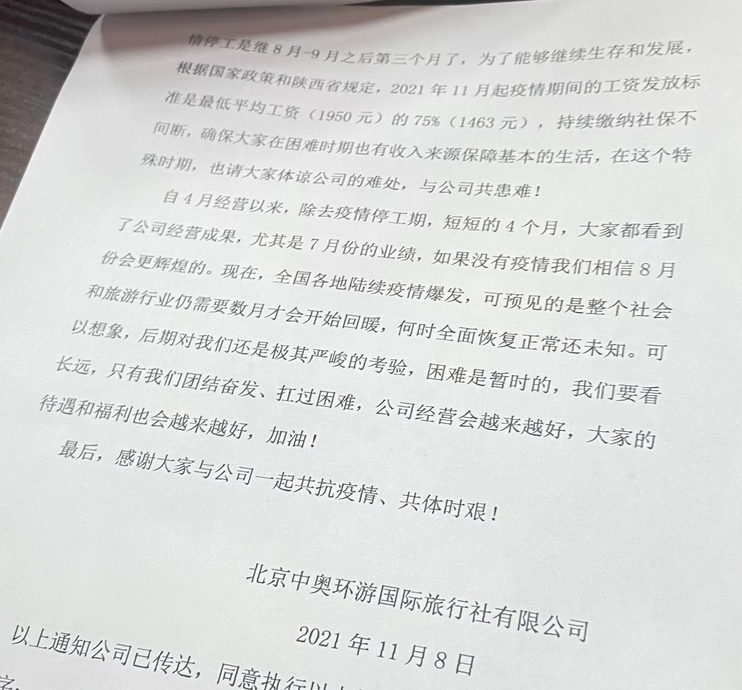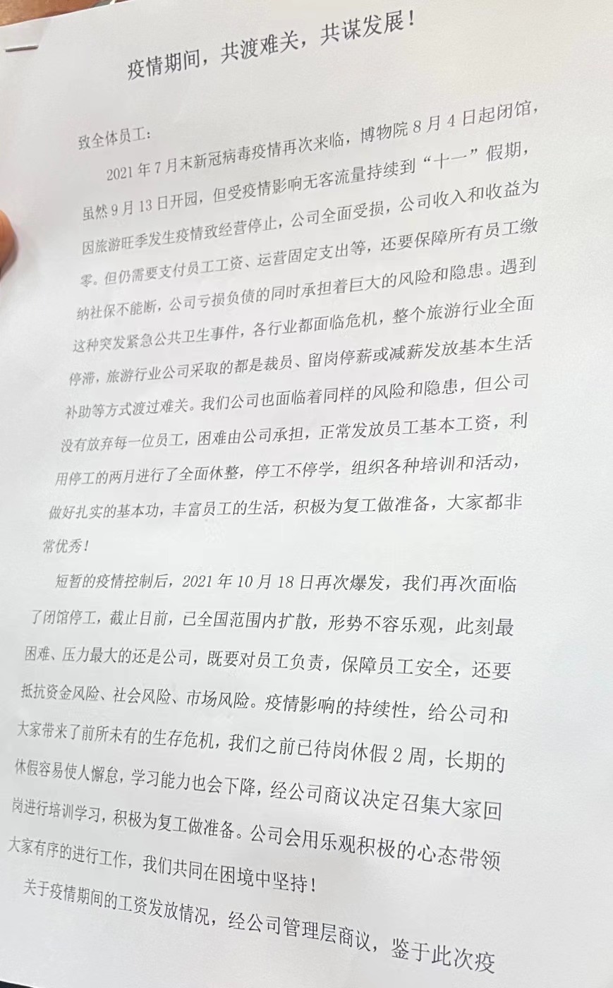進入單位之后由于疫情博物院斷斷續(xù)續(xù)閉館,閉館時會讓大家正常上班參加培訓,就在這次閉館之后,旅游公司給我們發(fā)了如下文件,工資1463元發(fā)放,遠低于西安市最低工資,而我們每天還要坐地鐵公交上下班,拿到手一千元,為什么我們正常上下班還要克扣工資,閉館也不是我們愿意看到的,但我們也要維持生活。
