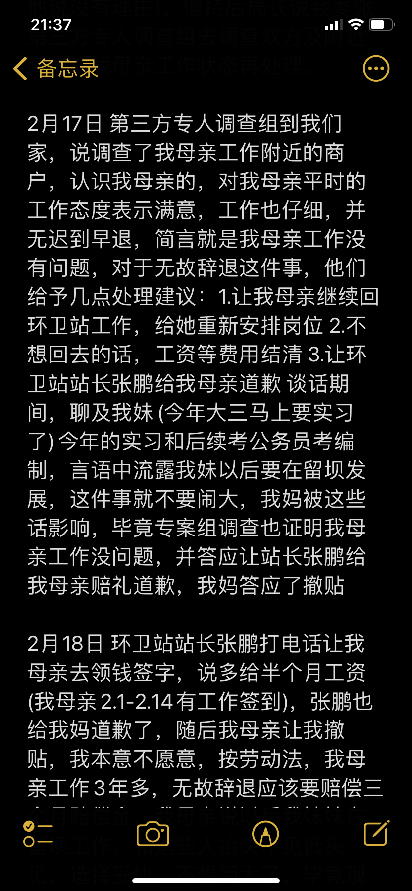 城建局局長張海霞委派第三方專人調(diào)查,調(diào)查結果——我母親王瓊芝工作認真,態(tài)度好,身體健康,無具體辭退理由,并給出處理建議:請我母親繼續(xù)回去工作,讓站長張鵬向我母親道歉。
