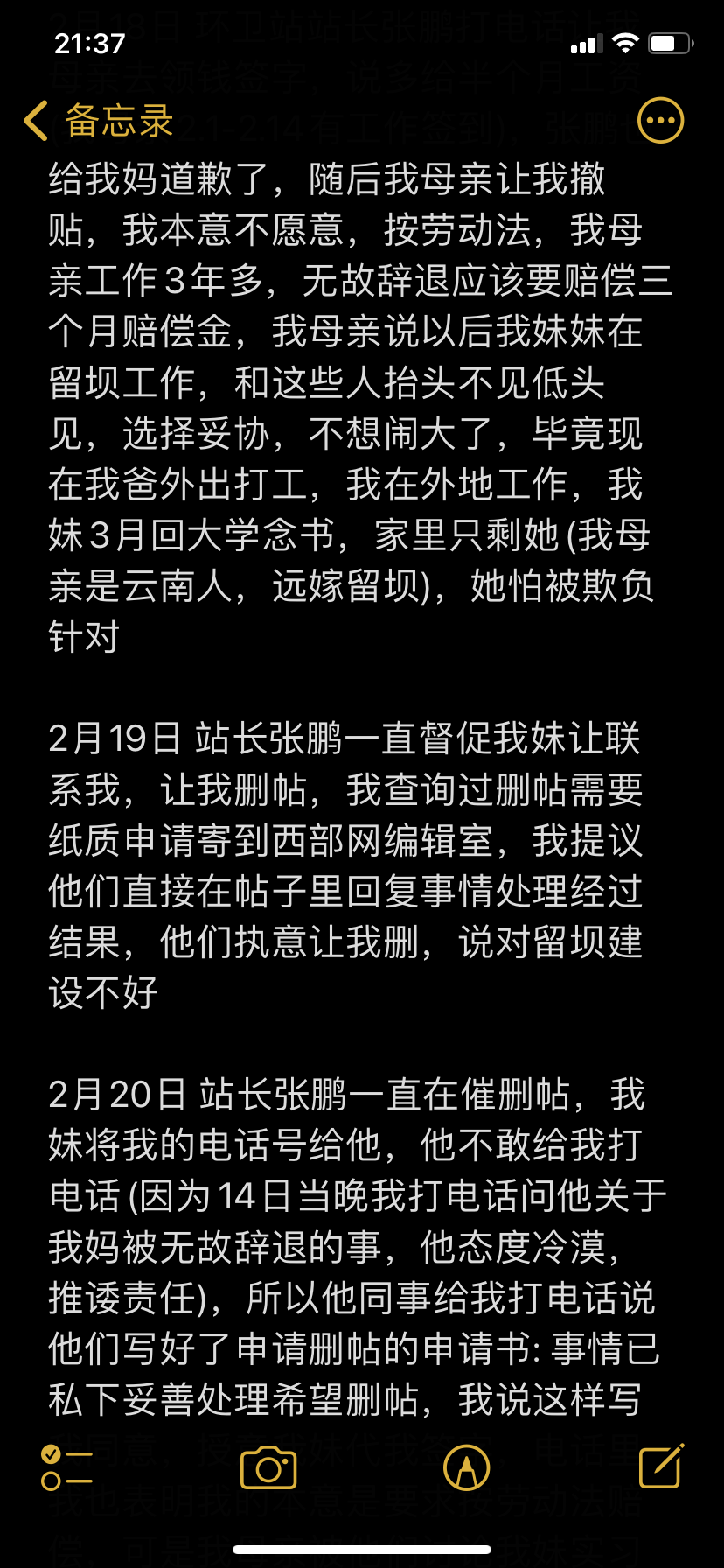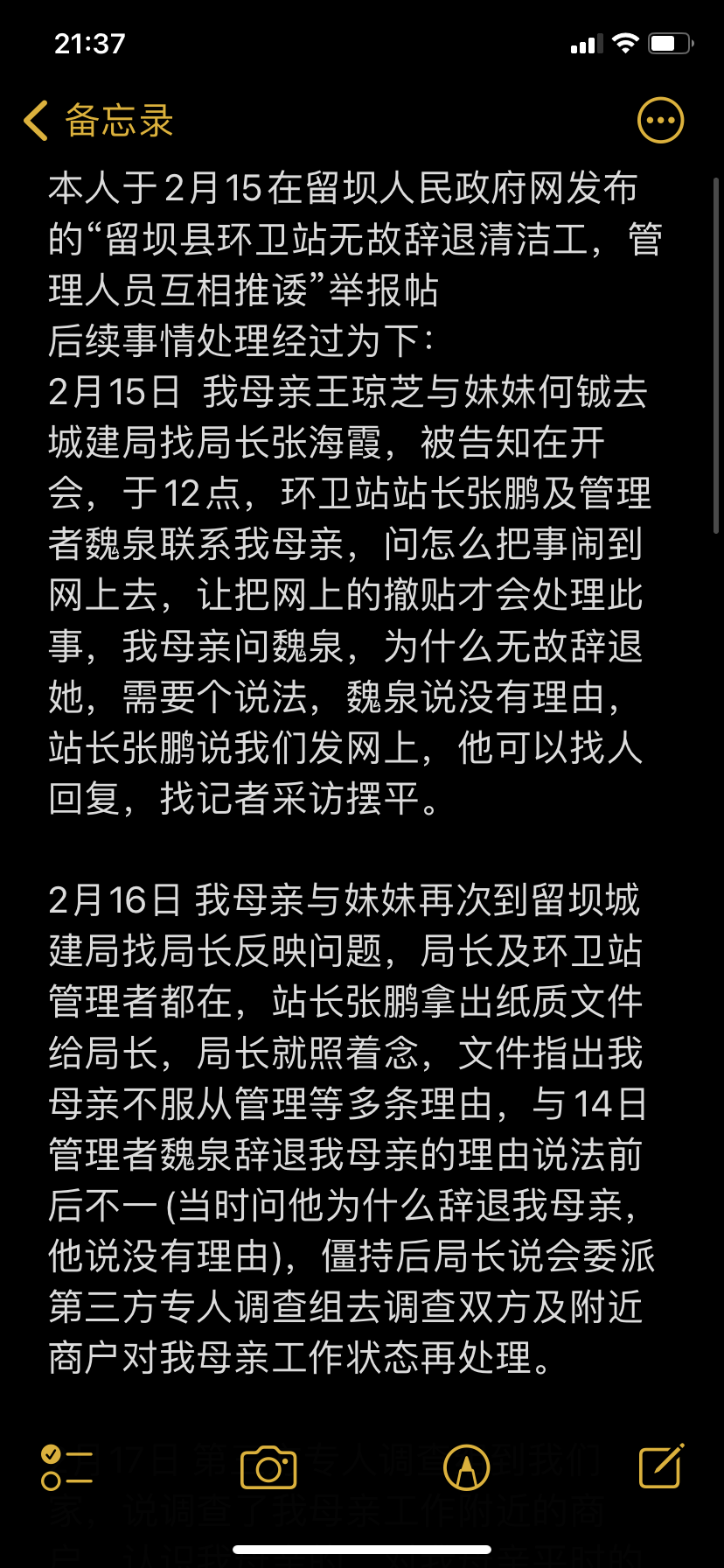 本人何靜于2月15日發(fā)布的“留壩縣環(huán)衛(wèi)站無故辭退清潔工,管理人員互相推諉”舉報帖后續(xù):(另附有圖片闡述詳細的事情經(jīng)過,下面文字為簡述)
