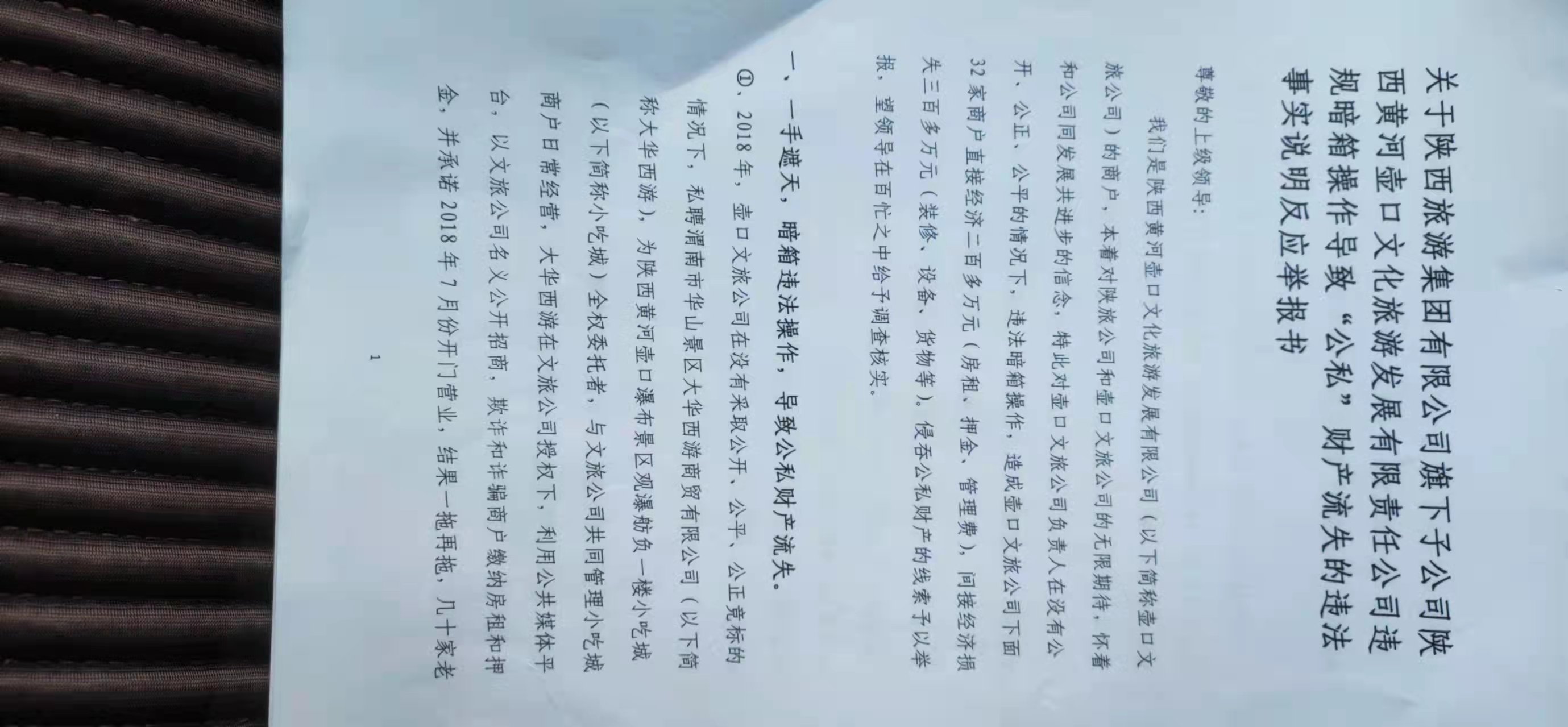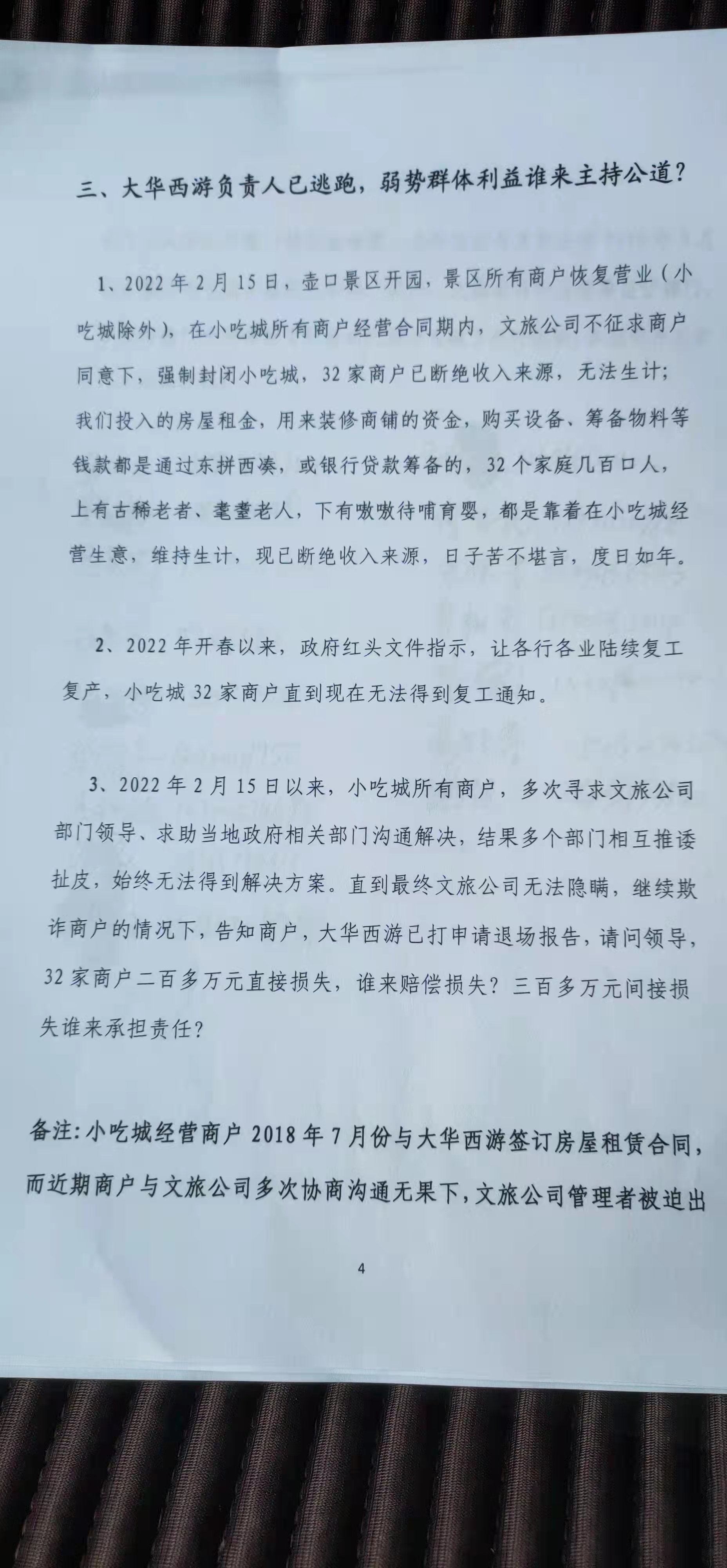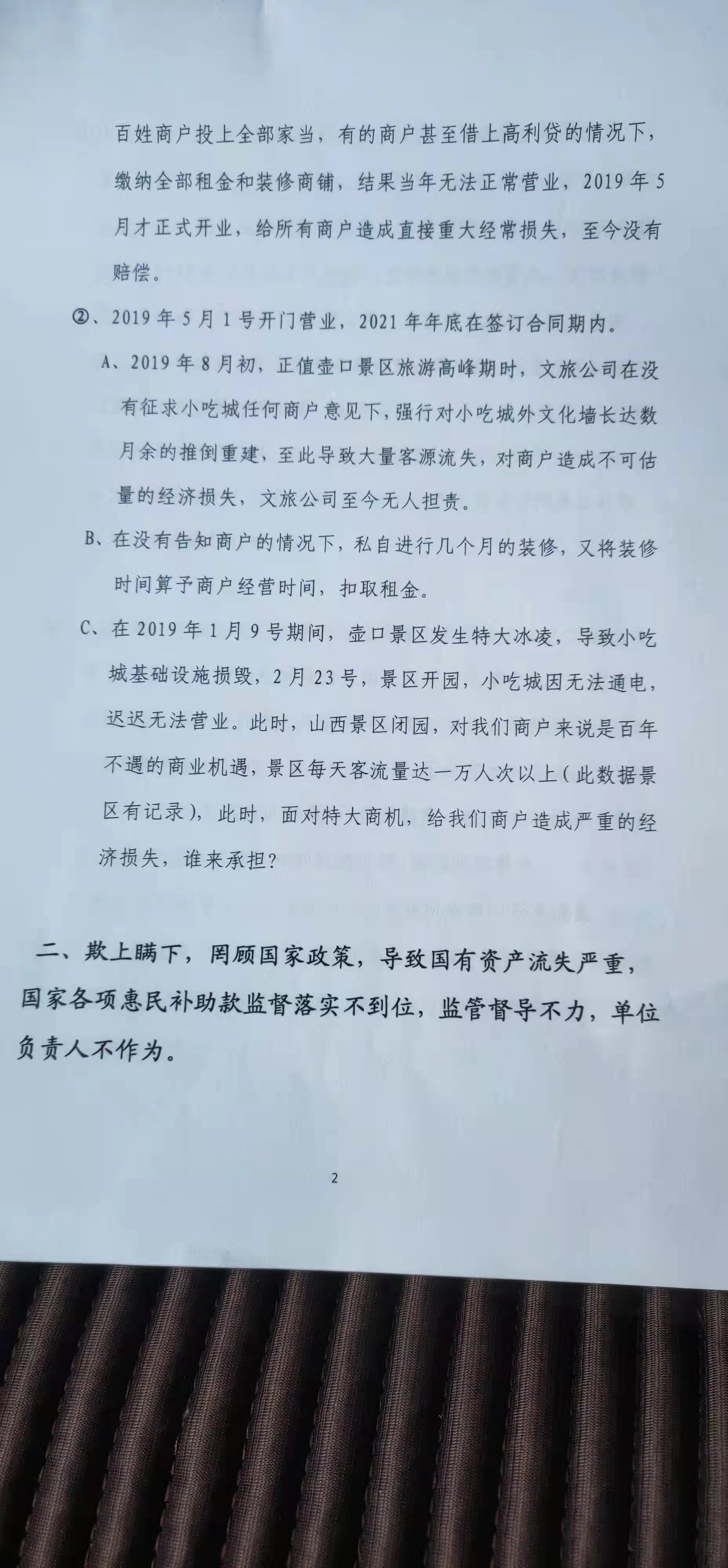 關(guān)于陜西黃河壺口文化旅游發(fā)展有限責(zé)任公司終止32家商戶,不能正常營業(yè)一事,請求陜西省本著“立黨為公,執(zhí)政為民”的原則,拯救正處于水深火熱之中的苦難商戶,希望領(lǐng)導(dǎo)快速做出正確的解決辦法。致使32家商戶直接經(jīng)濟損失200多萬(房租,押金,管理費),間接經(jīng)濟損失300多萬(裝修,設(shè)備,物料等)商戶信息:具體事由如下