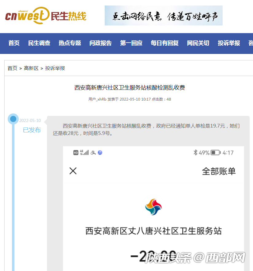 此外,西部網(wǎng)民生熱線還接到網(wǎng)友投訴稱:南稍門十字東南角的核酸采樣點(diǎn)“只做單人檢測(cè)”;西安高新區(qū)唐興社區(qū)衛(wèi)生服務(wù)站5月9日尚未執(zhí)行新收費(fèi)標(biāo)準(zhǔn),仍然按照28元的標(biāo)準(zhǔn)收取費(fèi)用;未央?yún)^(qū)明光醫(yī)院以前有混檢,現(xiàn)在只做單檢……