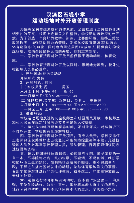 2022年8月18日,漢濱區(qū)石堤小學對運動場地對外開放管理制度進行了修訂,將開放時間調(diào)整為上午7:00-9:00。