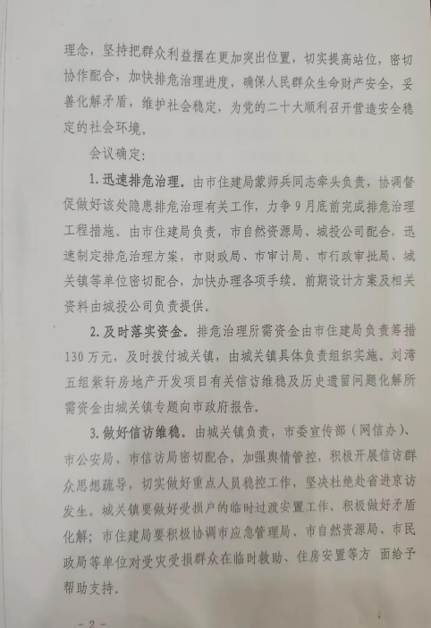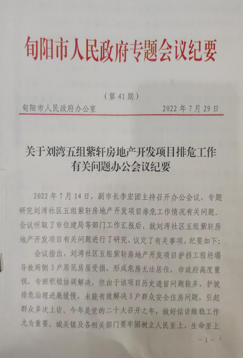 2022年7月14日,副市長李宏團(tuán)主持召開專題會議,下發(fā)會議紀(jì)要(旬陽市人民政府專題會議紀(jì)要2022年第41期),會議確定:一是由住建局牽頭負(fù)責(zé)協(xié)調(diào)督促做好該處隱患排危治理有關(guān)工作;二是由住建局負(fù)責(zé)籌措排危治理所需資金,撥付城關(guān)鎮(zhèn),由城關(guān)鎮(zhèn)具體組織實(shí)施;三是由城關(guān)鎮(zhèn)負(fù)責(zé),市委宣傳部(網(wǎng)信辦)、市公安局、市信訪局密切配合做好信訪維穩(wěn)工作。