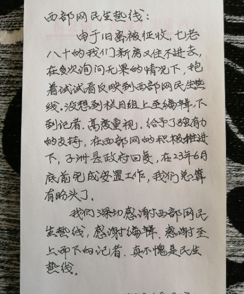 由于舊窯被征收,七老八十的我們新房又住不進去,在多次詢問無果的情況下抱著試試看反映到西部網(wǎng)民生熱線。沒想到欄目組上至編輯,下到記者,高度重視,給予了強有力的支持,在西部網(wǎng)的積極推進下,子洲縣政府回復(fù),在23年6月底前完成安置工作,我們總算有盼頭了。