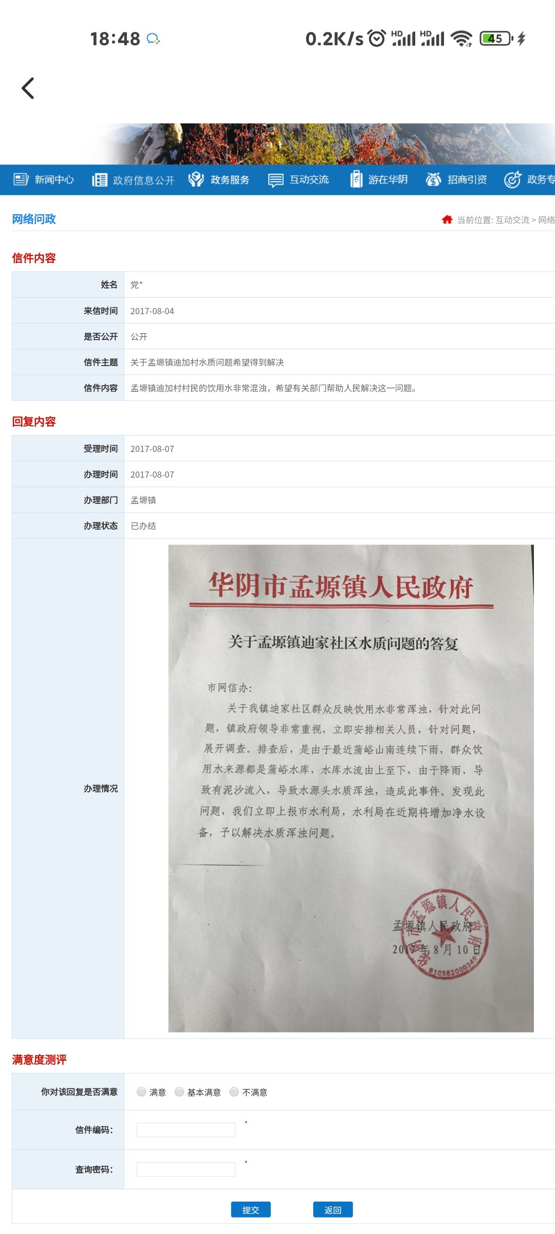 華陰市孟塬鎮(zhèn)人民政府回復(fù):關(guān)于西部網(wǎng)平臺(tái)反饋“孟塬鎮(zhèn)飲水渾濁發(fā)黃反映多年仍解決不了”的問(wèn)題。經(jīng)孟塬鎮(zhèn)監(jiān)察室干部入戶走訪調(diào)查,該群眾反映水質(zhì)渾濁問(wèn)題正處于2023年6月份短時(shí)強(qiáng)降雨后供水恢復(fù)階段,該問(wèn)題有暴雨過(guò)后蒲峪水庫(kù)水源渾濁凈化設(shè)備處理跟不上的問(wèn)題,以及啟動(dòng)各村自備井供水過(guò)程中管網(wǎng)存留前期水源的問(wèn)題。同時(shí),查看該群眾反饋的往年出現(xiàn)的水質(zhì)問(wèn)題,形成原因一致。具體形成原因如下: