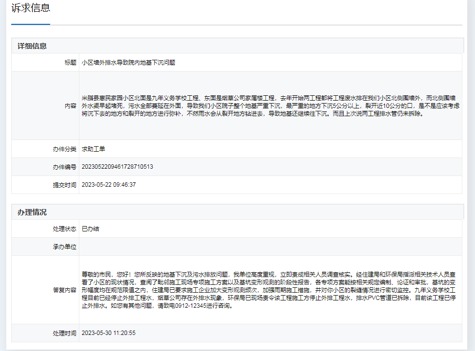 米脂縣惠民家園小區(qū)北面是九年義務(wù)學(xué)校工程、西面是煙草公司家屬樓工程,去年開始兩工程都將工程廢水排在我們小區(qū)北側(cè)圍墻外,而北側(cè)圍墻外水渠早起堵死,污水全部蔓延在外面,導(dǎo)致我們小區(qū)院子整個地基嚴(yán)重下沉,最嚴(yán)重的地方下沉5公分以上,裂開近10公分的口,是不是應(yīng)該考慮將沉下去的地方和裂開的地方進(jìn)行彌補(bǔ),不然雨水會從裂開地方鉆進(jìn)去,導(dǎo)致地基還繼續(xù)往下沉。而且上次說兩工程排水管仍未拆除?,F(xiàn)在又到雨季,每次一下雨居民們睡都睡不著,所有墻內(nèi)外的水全部進(jìn)入地下,下一場雨嚴(yán)重一次。向社區(qū),信訪部門,12345熱線反應(yīng)多少次,均無人管。