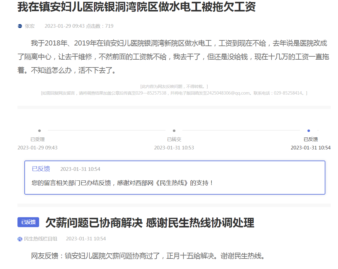 鎮(zhèn)安縣人民政府辦公室回復(fù):收到《西部網(wǎng)網(wǎng)上輿情調(diào)查函》( [2023] 第07142號)關(guān)于網(wǎng)友反映“鎮(zhèn)安縣婦兒醫(yī)院項目拖欠工人工資”的情況后,我縣高度重視,立即安排縣人社局勞動執(zhí)法人員開展調(diào)查,現(xiàn)就調(diào)查處理情況函復(fù)如下: