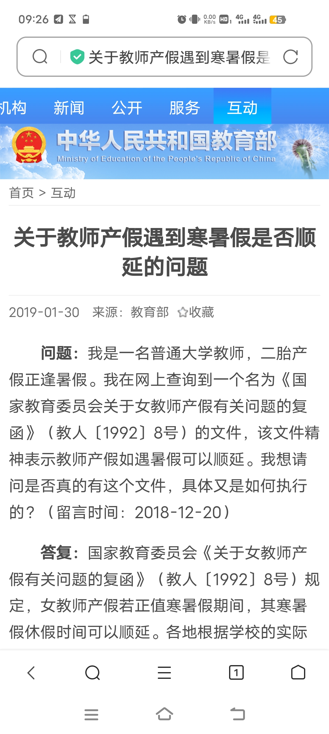 1.國家教育委員會《關于女教師產假有關問題的復函》(教人〔1992〕8號)規(guī)定,女教師產假若正值寒暑假期間,其寒暑假休假時間可以順延。