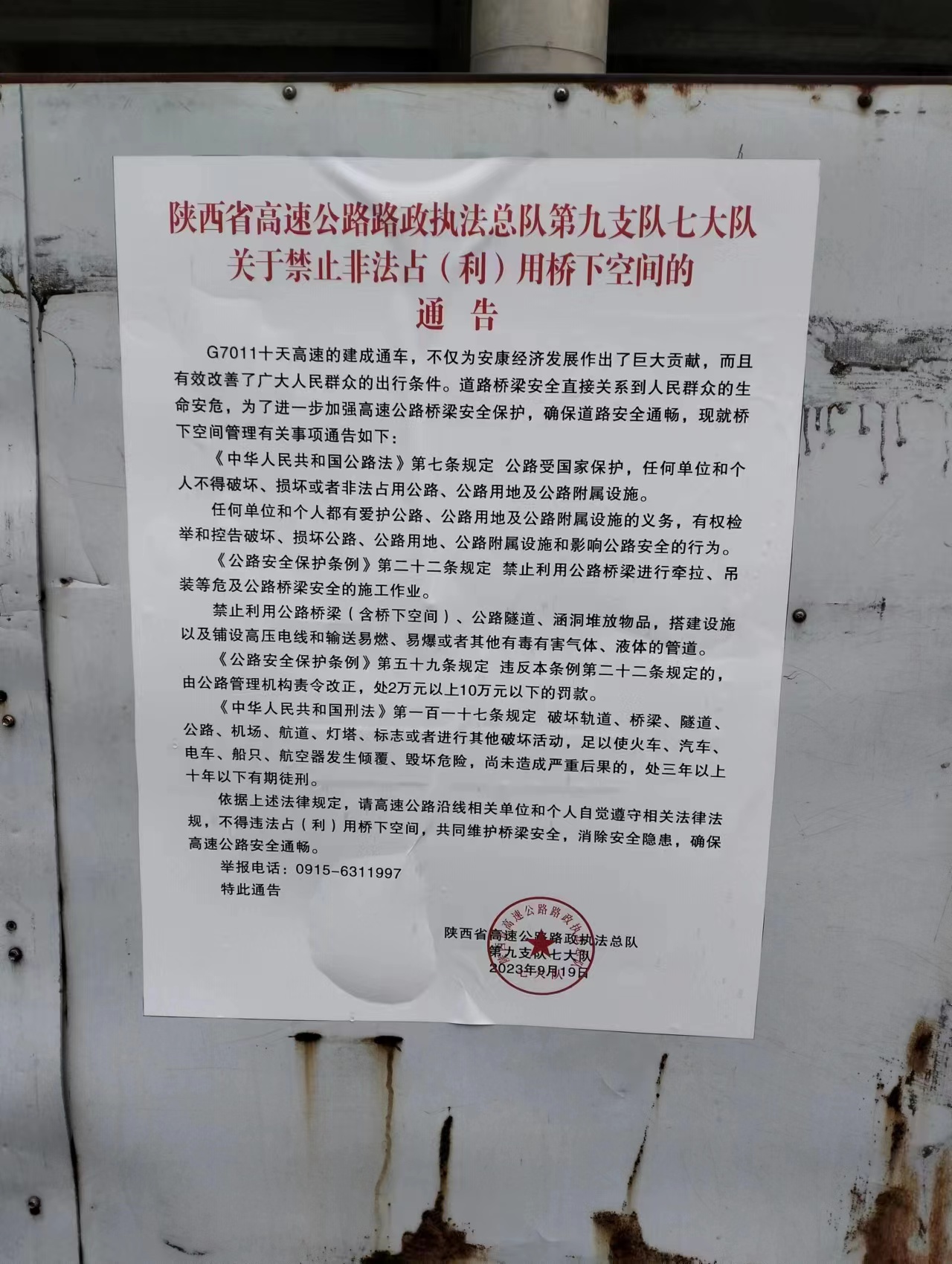 漢陰縣火車站站前“十天”高速高架橋下舉辦的“2023漢陰縣服裝服飾交易會”,具有嚴重的安全隱患。商戶們用圍擋將高架橋橋下圍攏起來,采用煤氣兜售燒烤等餐飲,產(chǎn)生的煙霧升騰起來,影響高速路上過往司機的視線;商戶們把煤氣罐串聯(lián)在一起,售賣的又是服裝服飾等易燃品,一旦發(fā)生火災(zāi)后果不堪設(shè)想;交易會選址在火車站站前也極為不當,給橋下交通帶來嚴重堵塞。請求貴部門予以關(guān)注處理。