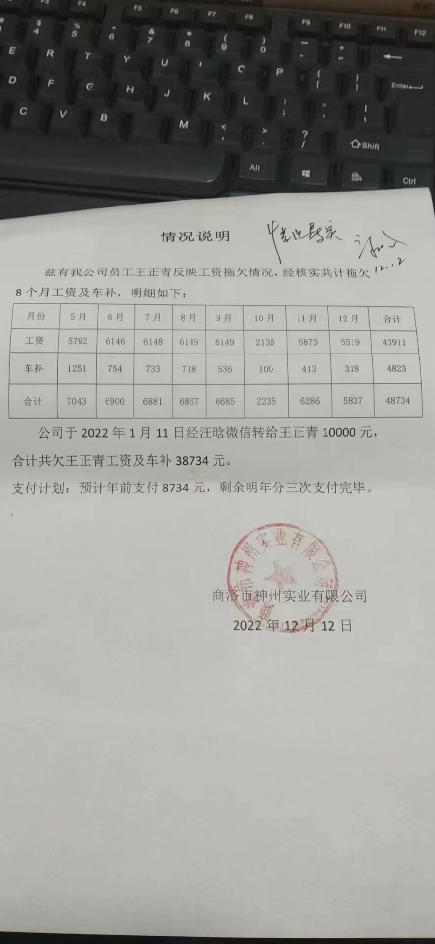 商南縣工業(yè)園神州實業(yè)有限公司已停工兩年有余,工資拖欠遲遲沒有兌現(xiàn),至今欠2021年6-12月份工資未發(fā)放,欠新:31691元。多次討要未果,上報勞動監(jiān)察部門后,公司制定了還款計劃(計劃是2023年分三次解決),依然沒有實質性進展,萬般無奈下只好求助政府協(xié)助解決,農民工掙錢養(yǎng)家不易,急需政府領導給予幫助,非常感謝!
