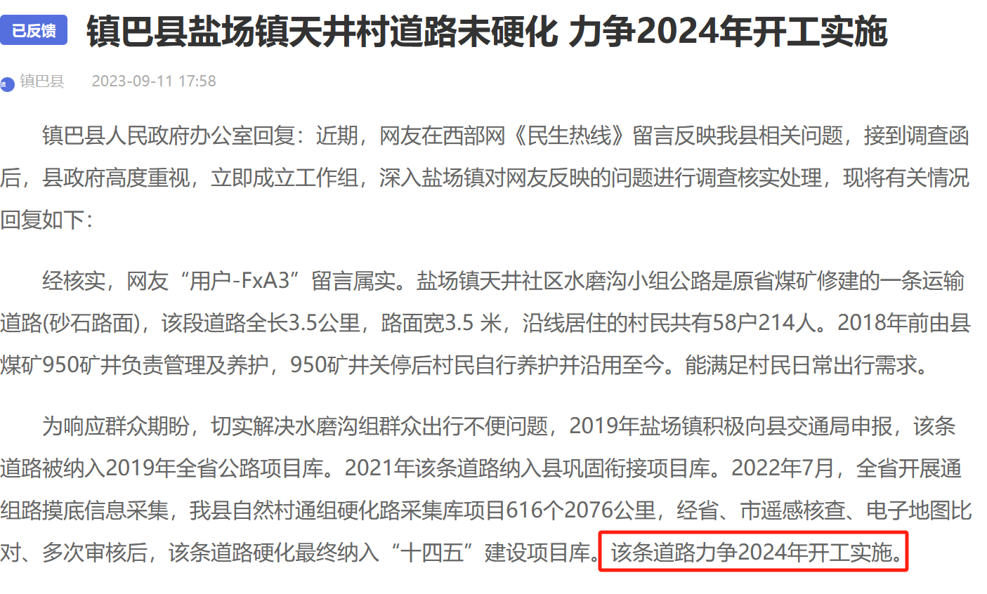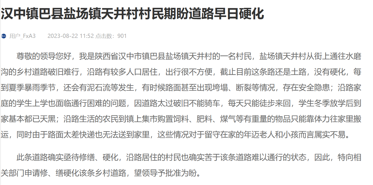 網(wǎng)友“用戶(hù)-FxA3”向西部網(wǎng)《民生熱線(xiàn)》反映:“漢中鎮(zhèn)巴縣鹽場(chǎng)鎮(zhèn)天井村的道路2024年能硬化嗎?”。