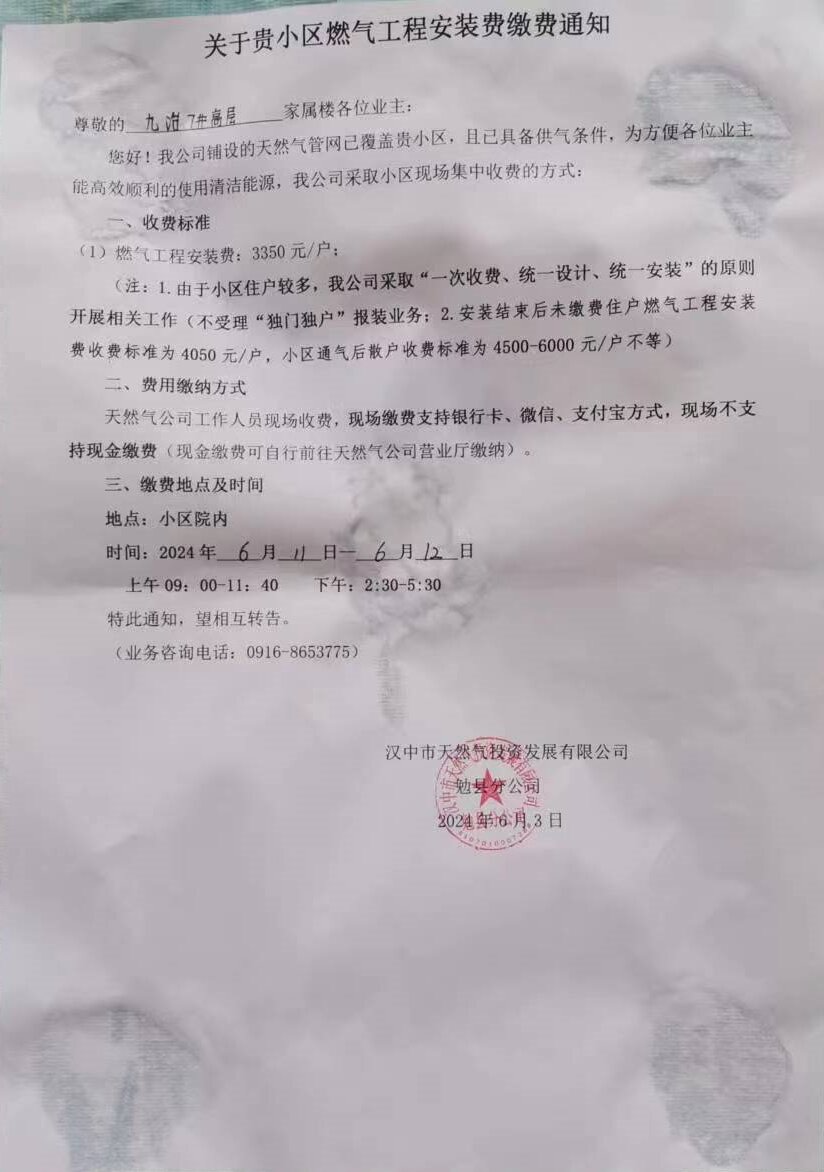 近日勉縣九冶小區(qū)要統(tǒng)一安裝天然氣,每戶要求繳納3350元,國家發(fā)改委585號文件明確通知,天然氣公司不能以任何形式收取天然氣進(jìn)戶費(fèi),為什么還有這種費(fèi)用,而且只給兩天繳費(fèi)時間,過了統(tǒng)一繳費(fèi)期,以后再安裝價格會更高,這種強(qiáng)迫性質(zhì)的做法,真的合理嗎?