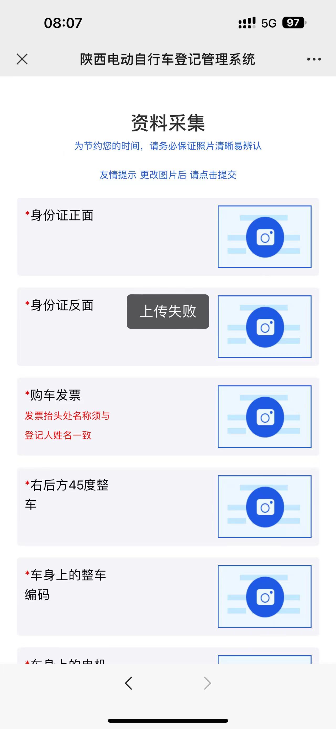 陜西公安交警電動自行車管理平臺系統(tǒng)故障,照片上傳一直上傳失敗,換了手機(jī)和更換照片都不能上傳成功,無法繼續(xù)下一步,咨詢電話也打不通。車管所說要預(yù)約才能辦理掛牌,但系統(tǒng)故障卻無法預(yù)約辦理電動車牌照,請有關(guān)部門及時處理。