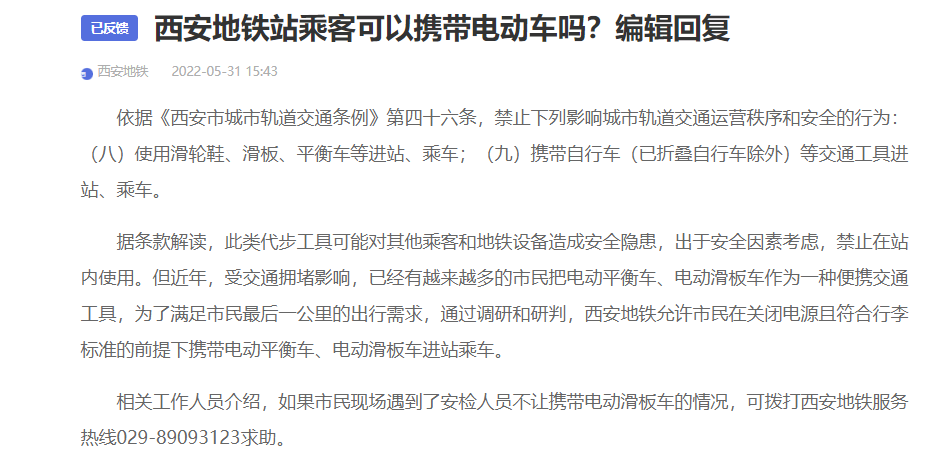 根據(jù)《西安市城市軌道交通條例》第四十六條相關(guān)規(guī)定,西安地鐵充分考慮市民攜帶電動(dòng)便攜代步工具乘車的需求,在確保乘車安全的前提下,經(jīng)過(guò)前期綜合研判,目前電動(dòng)滑板車(平衡車)在關(guān)閉電源的情況下允許攜帶進(jìn)站乘車。后續(xù),我公司將持續(xù)加強(qiáng)一線安保安檢人員業(yè)務(wù)水平,進(jìn)一步做好安全提醒及引導(dǎo),努力為市民乘客提供安全便捷的乘車體驗(yàn)。