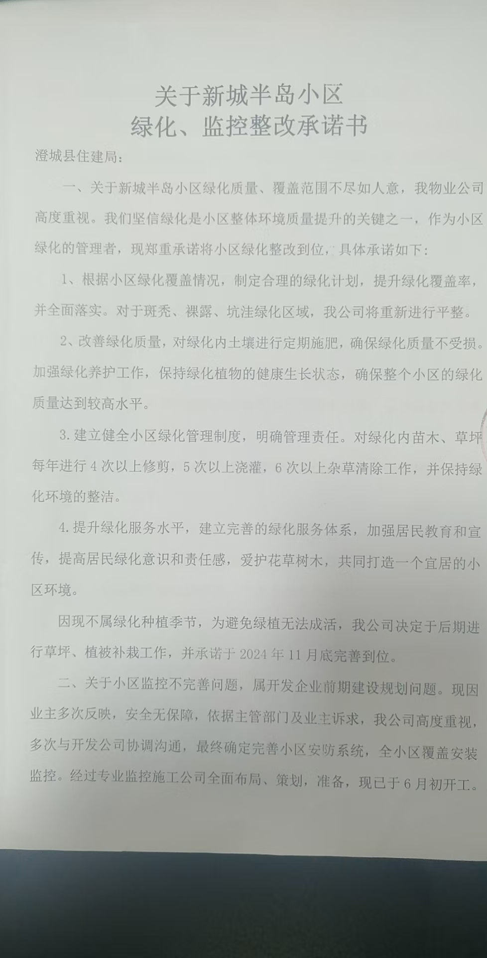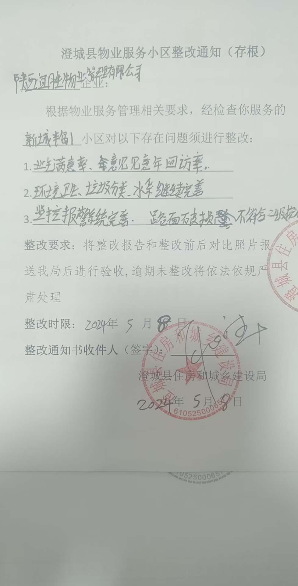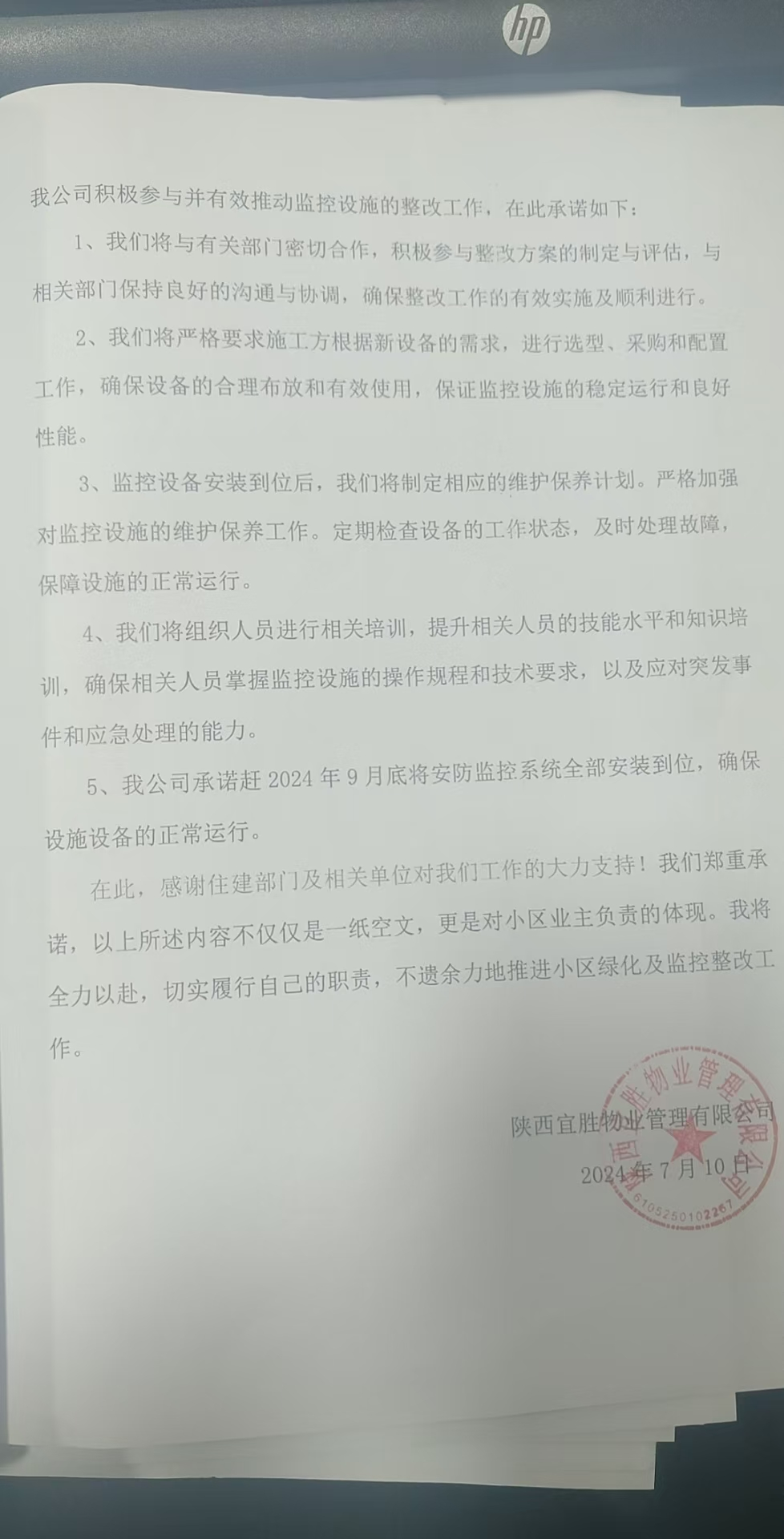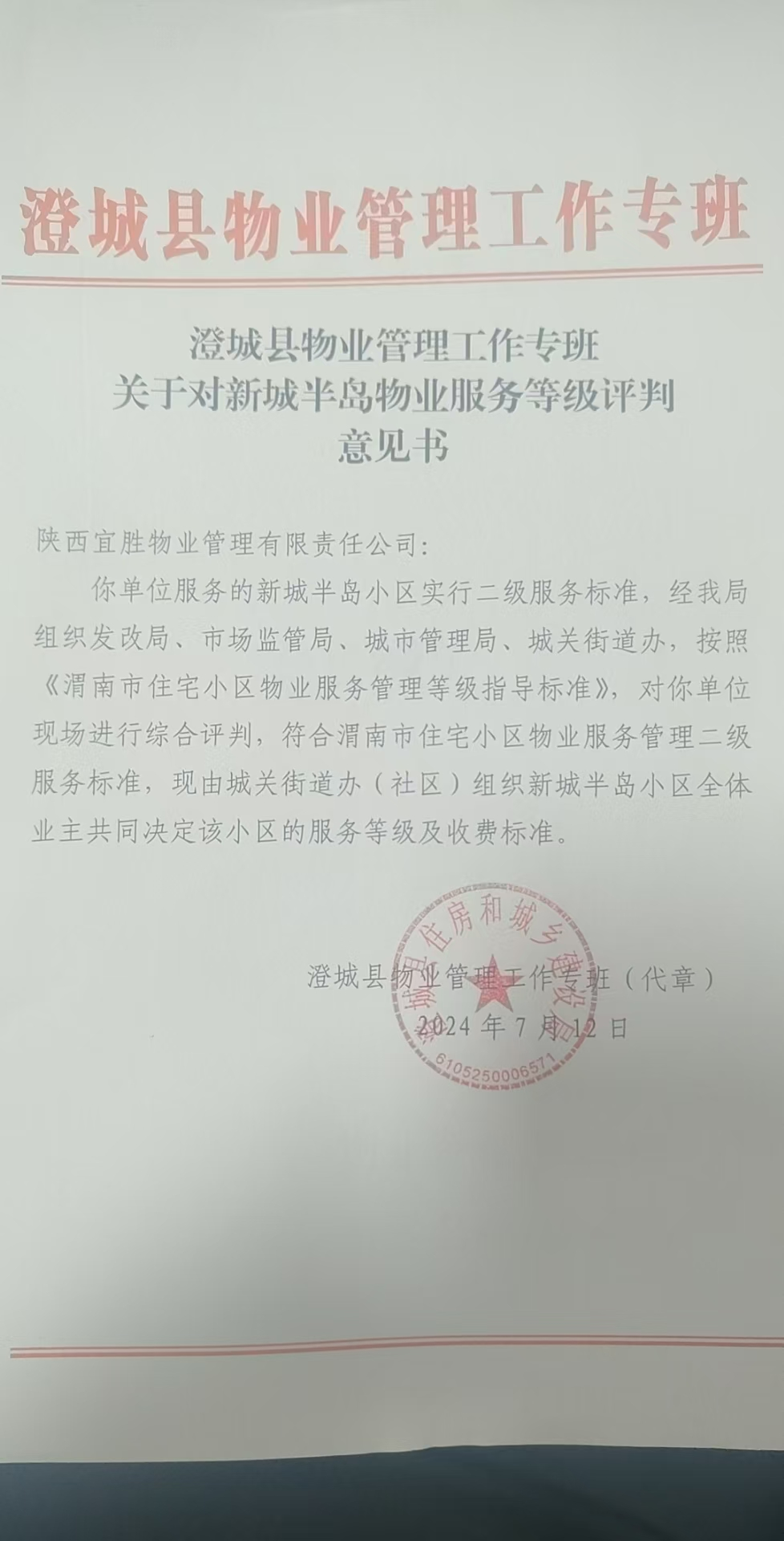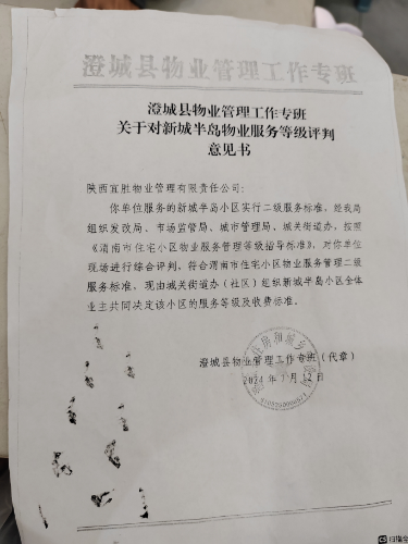小區(qū)業(yè)主多次向主管部門提出訴求后,主管部門讓物業(yè)公司暫停收費,然后組織政府個部門聯(lián)合對新城半島小區(qū)物業(yè)進行評級(真假不知)。2024年7月12日澄城縣住建局出具一份文件,顯示宜勝物業(yè)管理有限公司符合二級標(biāo)準(zhǔn)(文件附后)。實際情況是小區(qū)的物業(yè)公司7月份才開始整改綠化問題,以前是大面積的野草或空地,文件出后才開始安裝監(jiān)控,實際到位時間為8月份-9月份。也就是說文件的出具的時候該小區(qū)物業(yè)存在諸多問題,住建局給陜西宜勝物業(yè)管理有限公司出具的這份文件存在弄虛作假的問題。