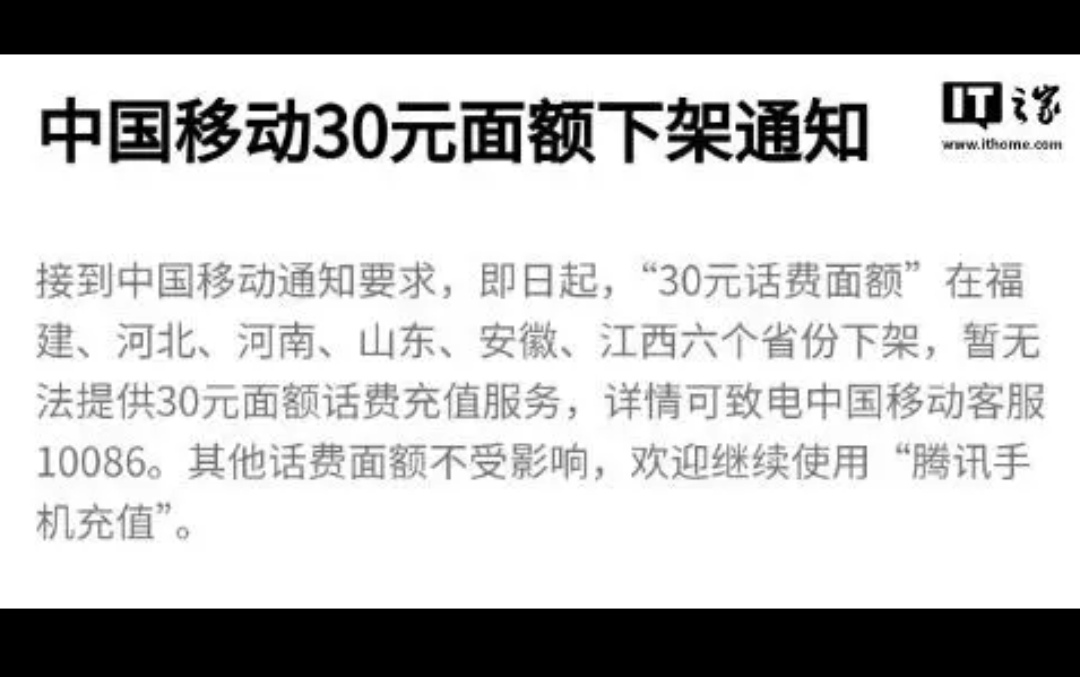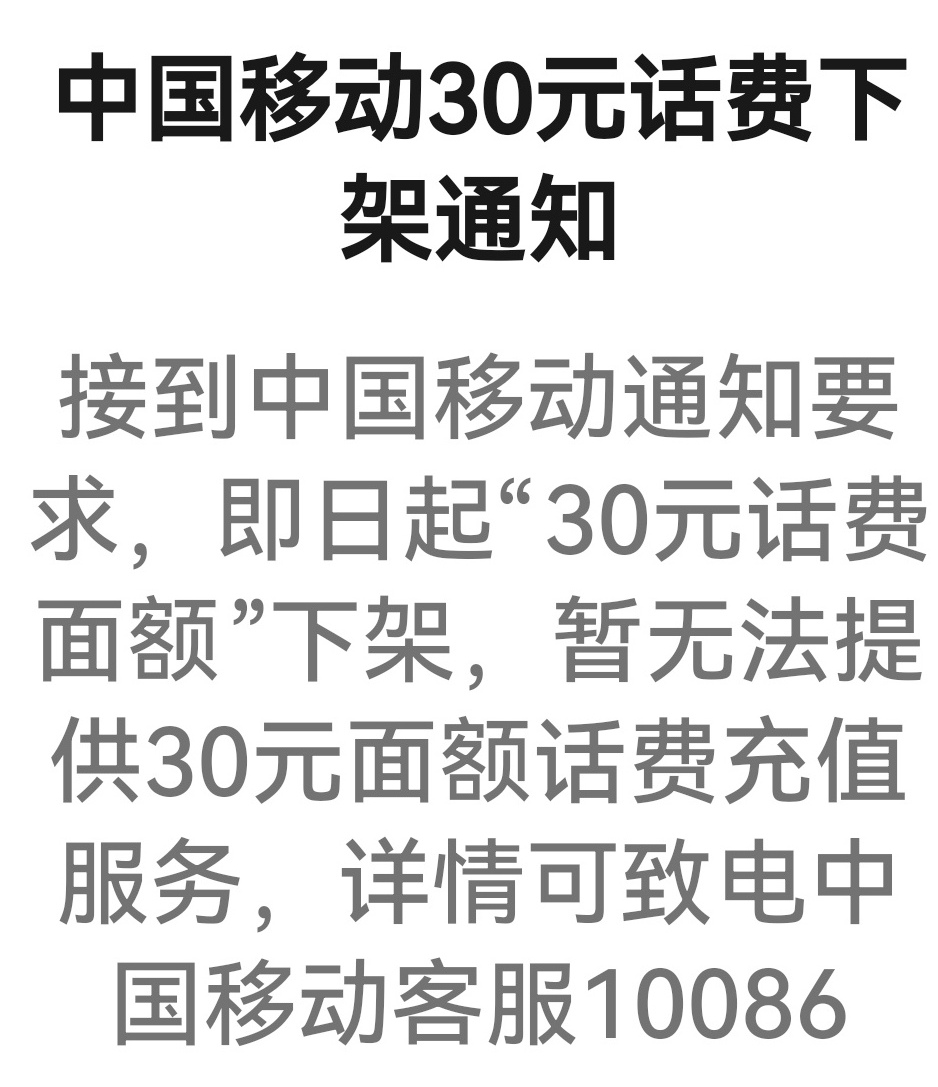 2024年11月24日,騰訊手機充值中心發(fā)布:中國移動要求即日起,30元話費面額,在閩冀豫魯皖贛下架但陜西移動也無法充值。