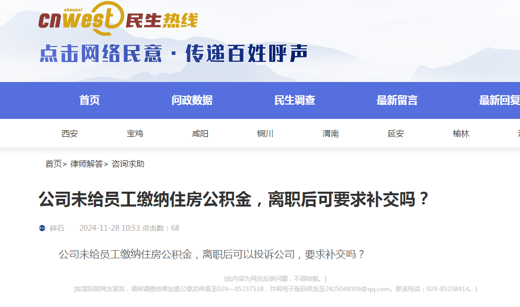 西部網(wǎng)訊(記者 楊晏寧)“我才知道原來公司一直沒有給我繳納住房公積金,我可以要求原公司補繳嗎?”近日,有網(wǎng)友向起點新聞·西部網(wǎng)民生熱線反映稱,自己曾在某公司工作了三年,離職后在求職過程中了解到,自己的公積金賬戶為空。“我找原公司要求給我補繳,但對方以我已經(jīng)離職為由拒絕補繳。”