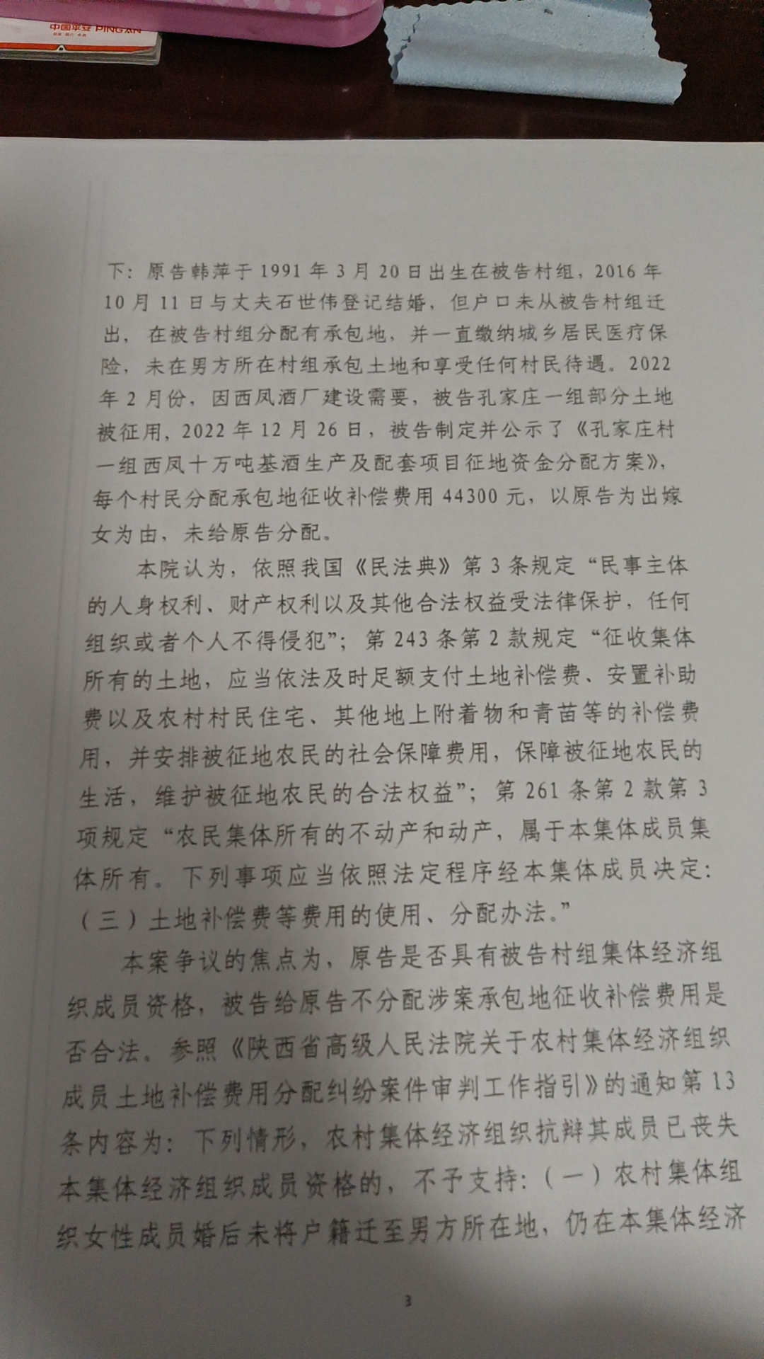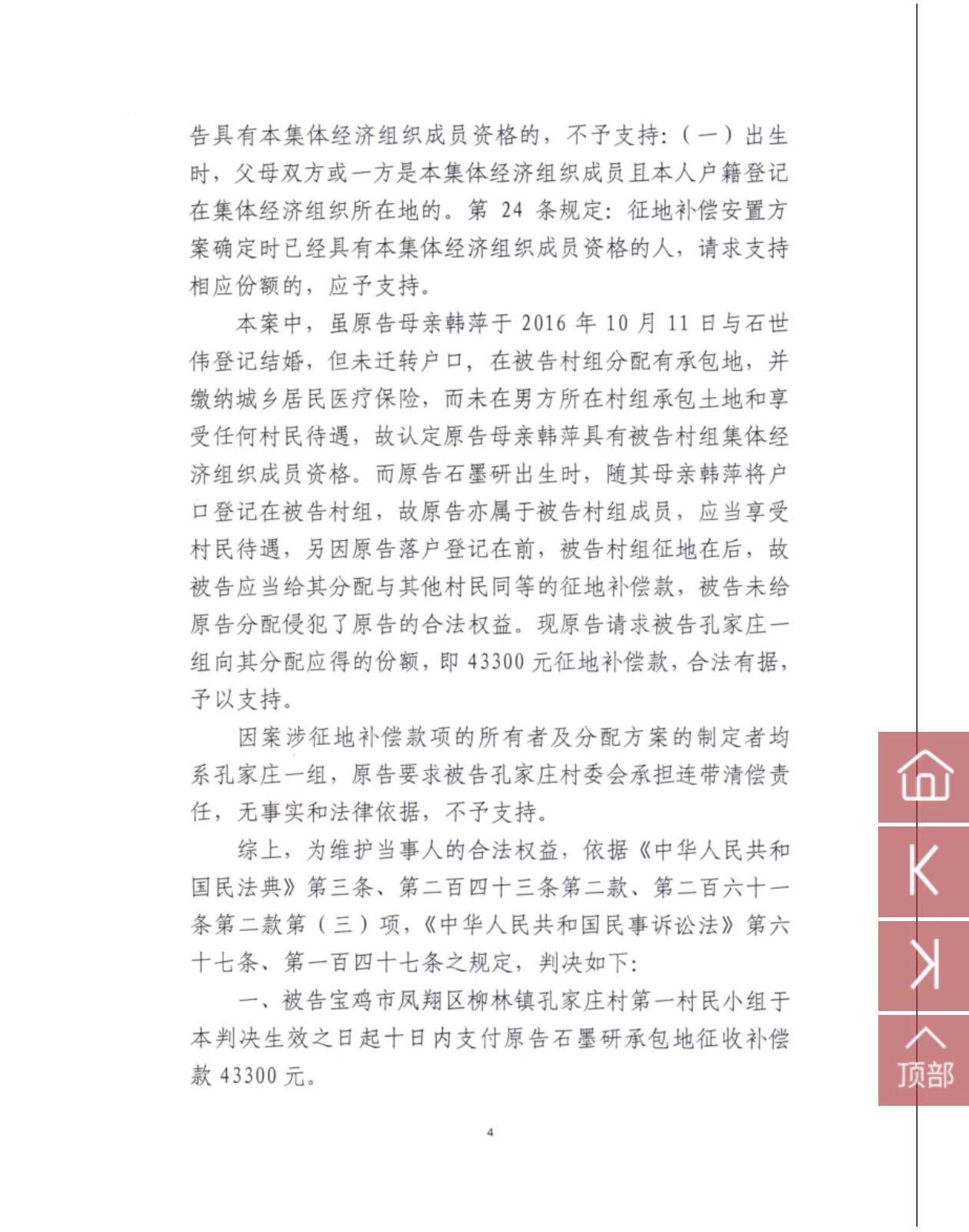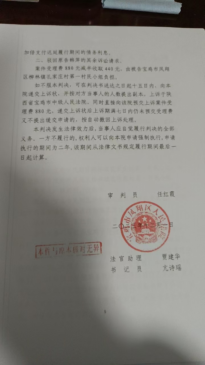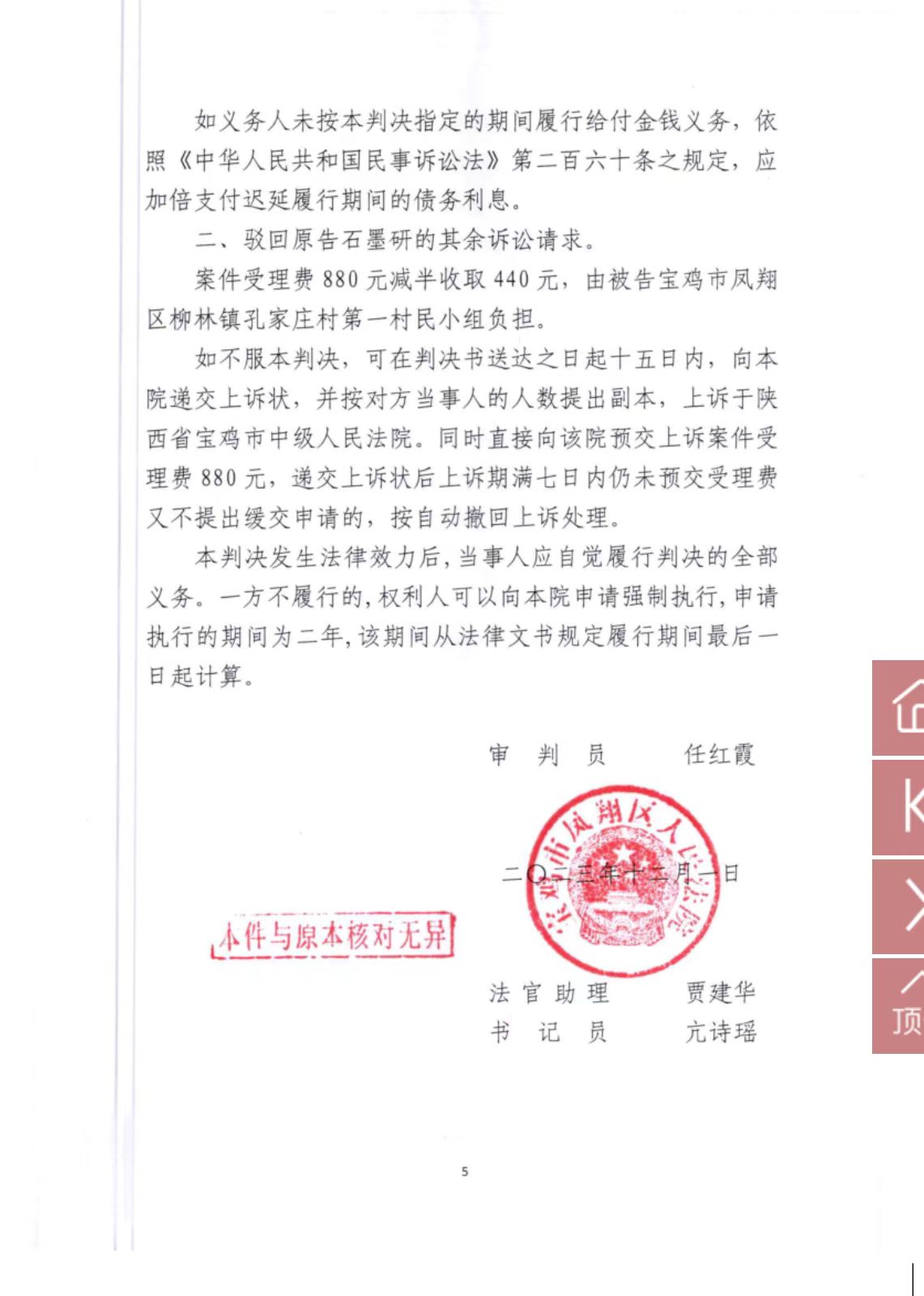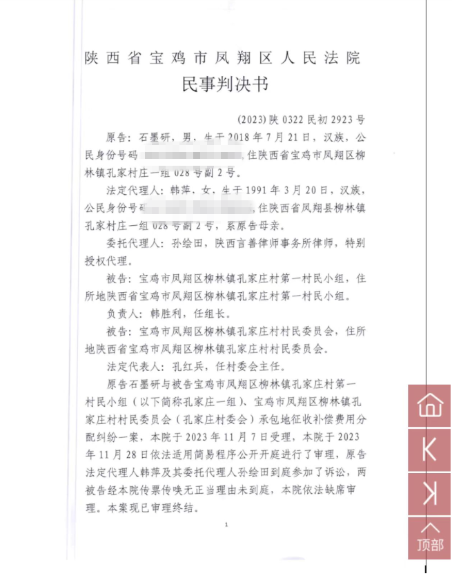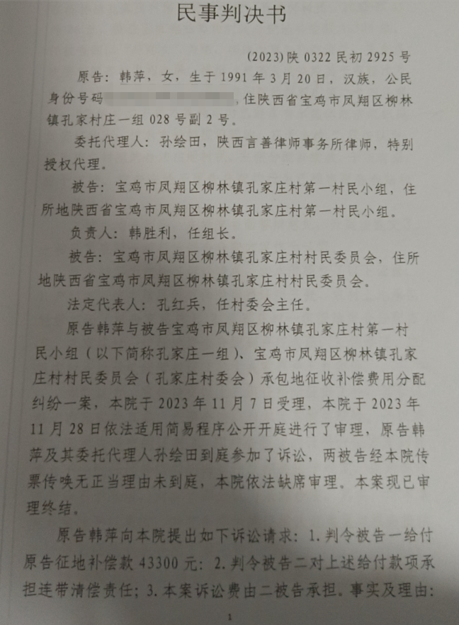 鳳翔區(qū)孔家莊村一組不按法院判決支付土地賠償款。
