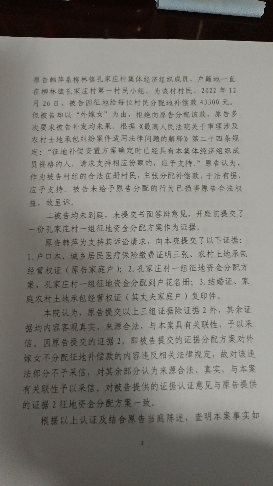 (一)關(guān)于孔家村第一村民小組未按照法律判決支付其本人及孩子的土地補(bǔ)償款