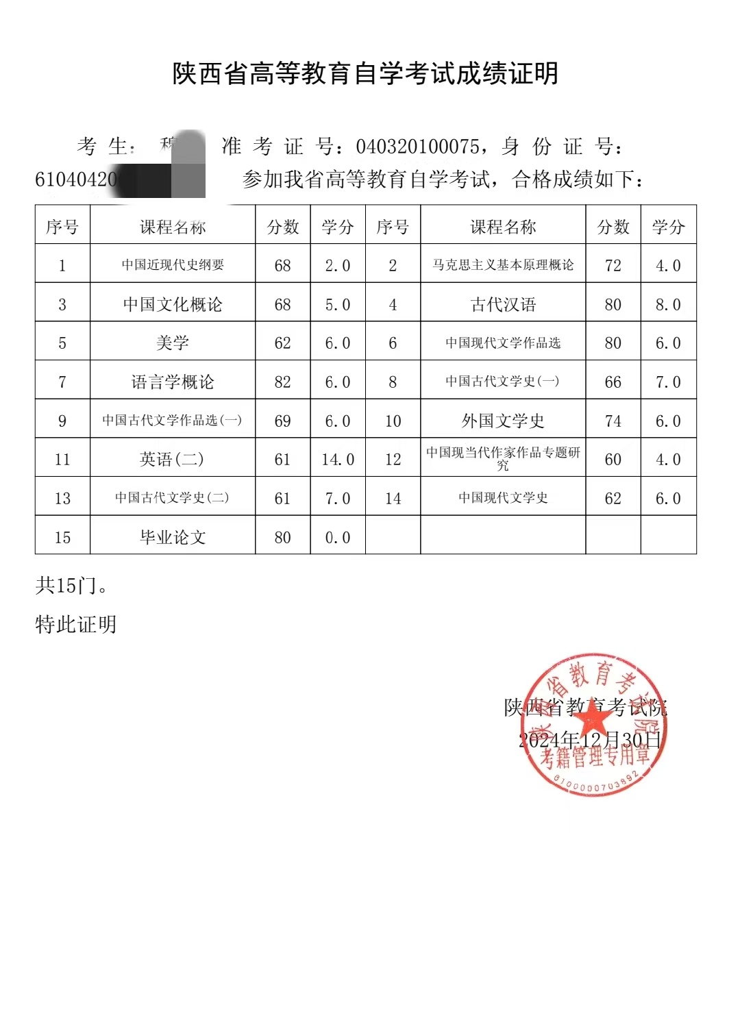 各位領(lǐng)導(dǎo)好,我是參加陜西自學(xué)考試漢語言文學(xué)(專升本)專業(yè)的考生穆某(準(zhǔn)考證號040320100075),我的所有科目及論文答辯均已合格,包括加考的科目也是均已合格。