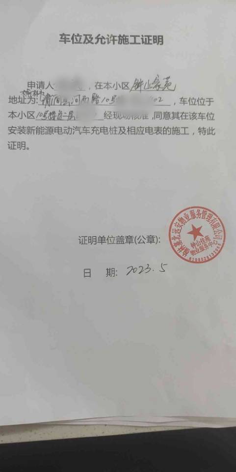 2023年5月清澗縣鐘山家苑小區(qū)物業(yè)開具了車位允許施工證明,同意業(yè)主接入國家電網(wǎng)安裝充電樁,經(jīng)國家電網(wǎng)現(xiàn)場勘測,符合安全要求并安裝電表。