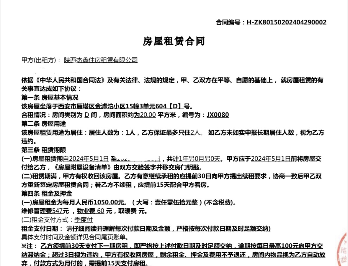 5月1日,我通過(guò)陜西杰鑫住房租賃有限公司在雁塔區(qū)金水園小區(qū)(金滹沱) 15幢3單元604 租房。入住后發(fā)現(xiàn)房間隔音極差,隱私性極差,房子被改造成隔斷房,中介公司更變房屋布局,把廚房改造成一間臥室,陽(yáng)臺(tái)與臥室合并租賃給我。三室一廳被隔斷成5間臥室,存在安全隱患,未配有消防設(shè)施。