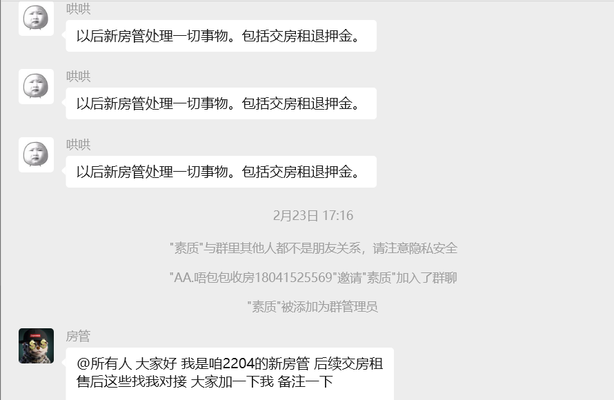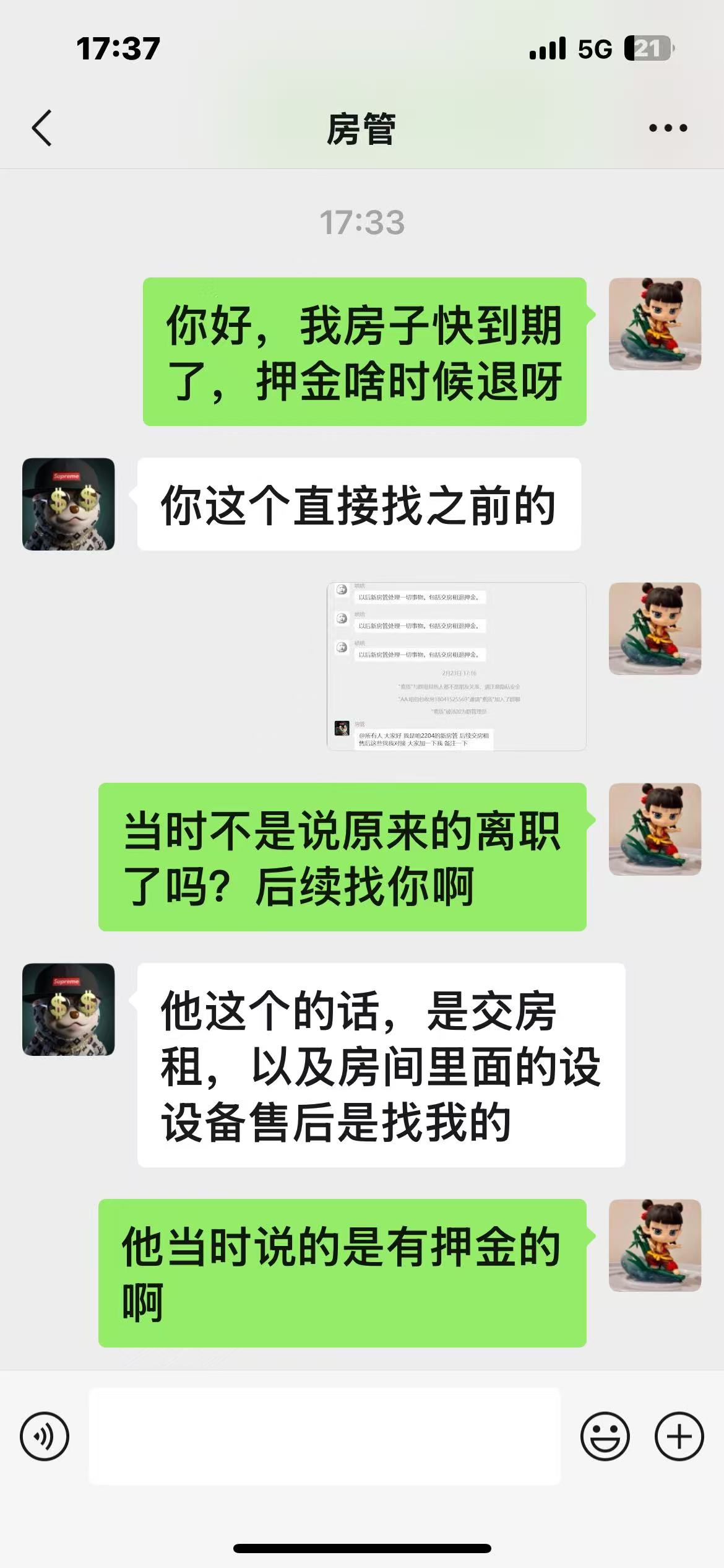 我于2024年7月從陜西潤豐居住房租賃有限公司租賃了鳳城十路城市星鉆1號樓1單元2204的一間房間,中介將一套三室一廳房子隔斷成5室出租,我房間押金是1千元,2025年2月左右,房管在群里說房子交接給西安華中偉業(yè)住房租賃有限公司管理,后續(xù)房租及押金問題找下一家公司處理。后續(xù)我們房租繳納很及時,7月房子到期退押金時,陜西潤豐居住房租賃有限公司和西安華中偉業(yè)住房租賃有限公司互相推脫,都讓我們找對方。我們五個住戶,到期的三戶共有3千元左右押金一直不給退,還拉黑微信,不接電話。