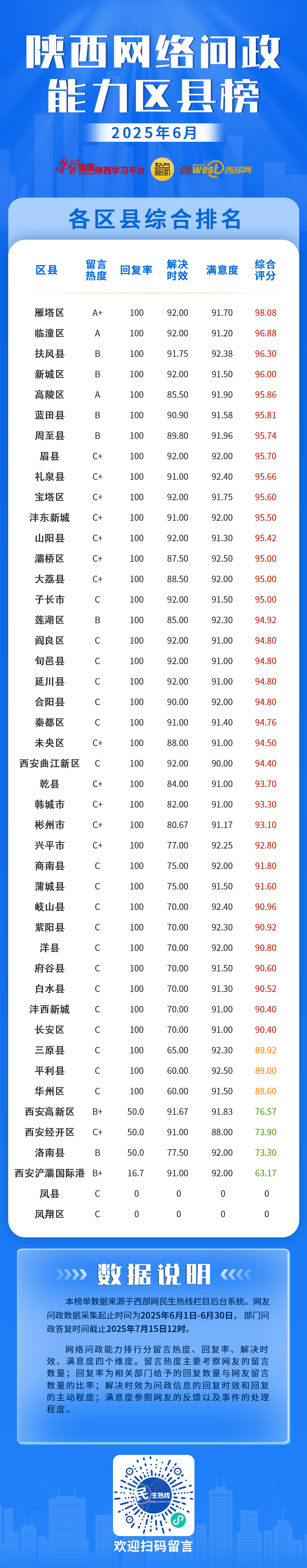2025年6月,西部網(wǎng)民生熱線與陜西45個區(qū)縣(開發(fā)區(qū))進(jìn)行了網(wǎng)絡(luò)問政溝通對接。根據(jù)各區(qū)縣(開發(fā)區(qū))留言熱度、回復(fù)情況和網(wǎng)友滿意度的綜合評定,西安雁塔區(qū)、西安臨潼區(qū)、寶雞扶風(fēng)縣分別以總分98.08、96.88、96.30位列網(wǎng)絡(luò)問政能力6月區(qū)縣榜前三名。