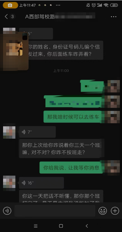 4.當(dāng)事人張某于2025年6月26日在終南鎮(zhèn)西部駕校報(bào)名,交費(fèi)3300元人民幣。7月19日通過科目一考試,7月20日起連續(xù)4天進(jìn)行科目二訓(xùn)練,此后未再進(jìn)行科目二練習(xí)。當(dāng)事人一段時(shí)間后與教練溝通練車時(shí)間,教練告知三天為一循環(huán)進(jìn)行訓(xùn)練,當(dāng)事人表示并不知情。溝通無果,且因教練態(tài)度較差,當(dāng)事人不愿再繼續(xù)學(xué)習(xí),并要求退費(fèi)。8月13日,駕校負(fù)責(zé)人與當(dāng)事人溝通協(xié)商,最終為當(dāng)事人更換駕校教練,當(dāng)事人表示滿意。