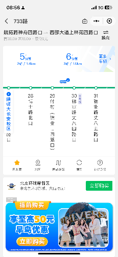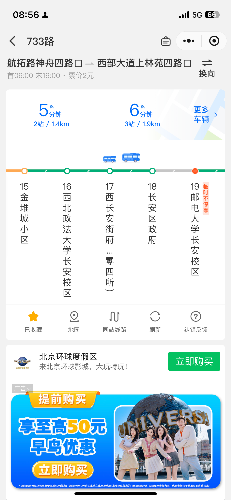 8點55分兩輛733路在丈八四路重合,兩輛733路在長安區(qū)政府重合。