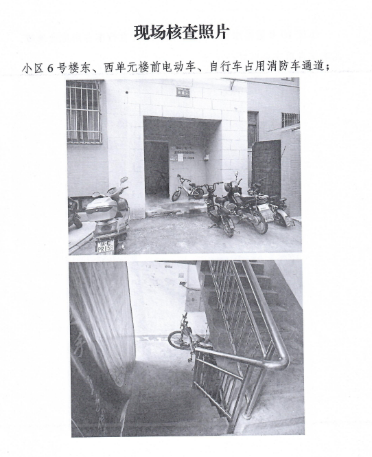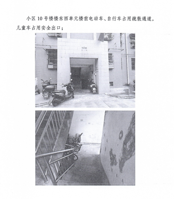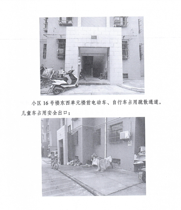2.小區(qū)10號樓、16號樓東西單元樓前電動車、自行車占用疏散通道,兒童車占用安全出口;