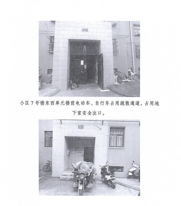 3.小區(qū)7號樓東西單元樓前電動車、自行車占用疏散通道占用地下室安全出口。