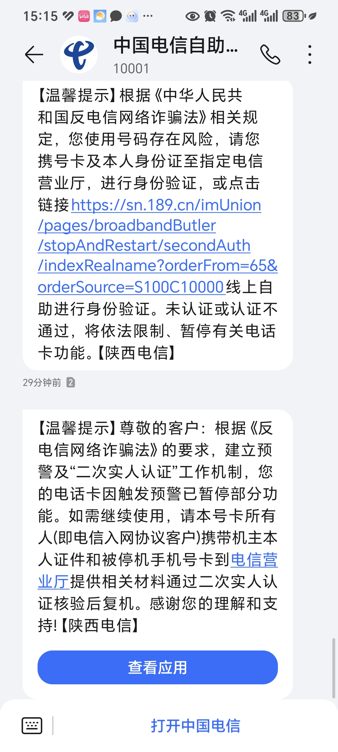 10月6日下午兩點(diǎn)五十左右,電信發(fā)來(lái)短信提示我號(hào)碼(173****3865)存在風(fēng)險(xiǎn)需要認(rèn)證,我忘記這個(gè)號(hào)碼是自己身份證辦理的還是用我爸身份證辦理的,就用自己身份證線上認(rèn)證,結(jié)果認(rèn)證不成功。十分鐘過(guò)后,三點(diǎn)左右我的手機(jī)卡被暫停各項(xiàng)功能,根本沒(méi)有時(shí)間去解決,我打電話想找人工客服咨詢下如何處理,一直打不通電話。此卡綁定了我很多網(wǎng)絡(luò)賬號(hào),一直是自用,也不知道是什么風(fēng)險(xiǎn)被列為風(fēng)險(xiǎn)號(hào),并且人在外省,根本不知道如何處理、找誰(shuí)處理,我理解也愿意配合相關(guān)風(fēng)險(xiǎn)排查,但要起碼給人處理的時(shí)間吧。陜西電信絲毫不考慮用戶權(quán)益,直接??ǎ稍儫o(wú)門(mén),現(xiàn)在投訴連驗(yàn)證碼都接收不了。