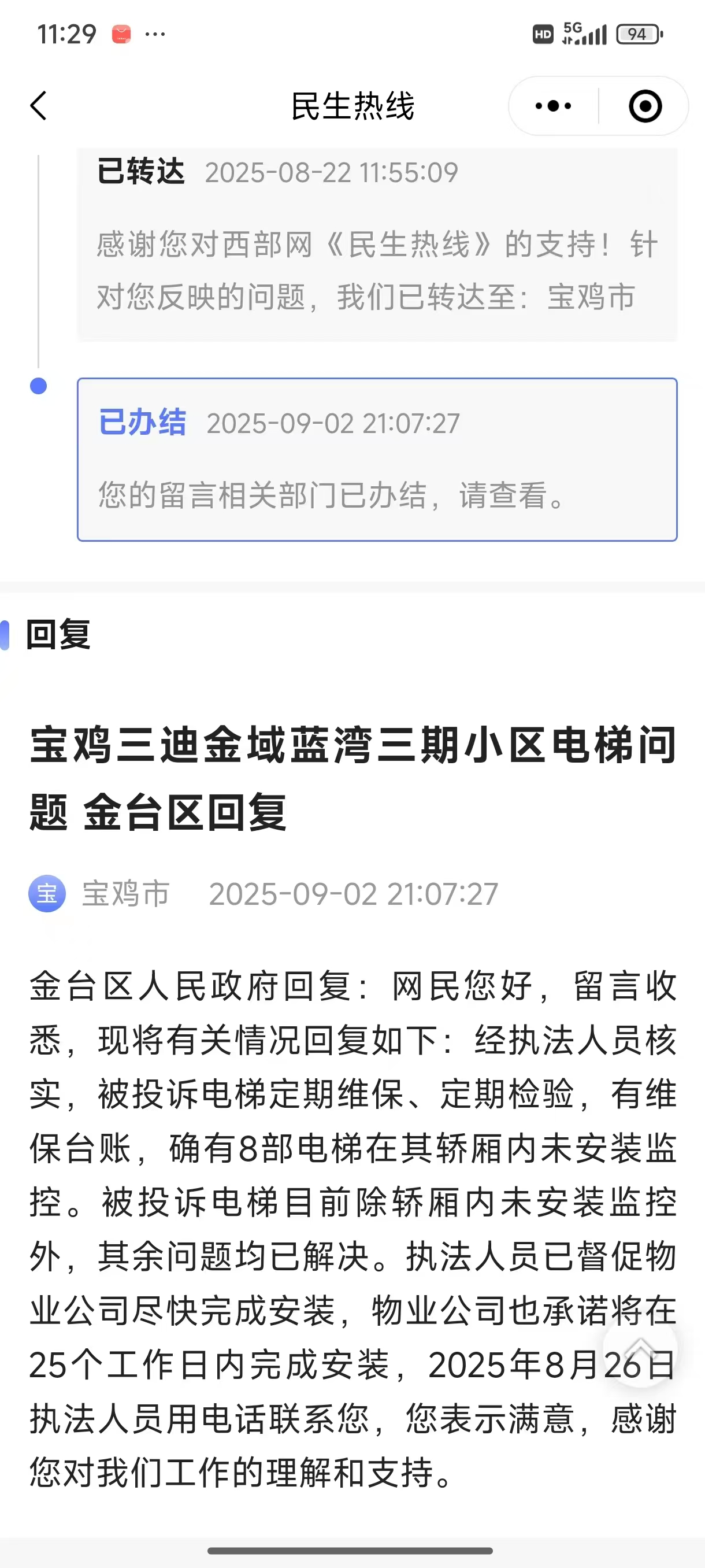 您好!我于2025年8月通過西部網(wǎng)《民生熱線》反映寶雞三迪金域藍灣三期小區(qū)120號樓電梯未安裝監(jiān)控的問題。2025年9月2日金臺區(qū)人民政府在回復(fù)中明確表示:物業(yè)公司承諾在25個工作日內(nèi)完成監(jiān)控安裝(應(yīng)于2025年9月底前完成)。