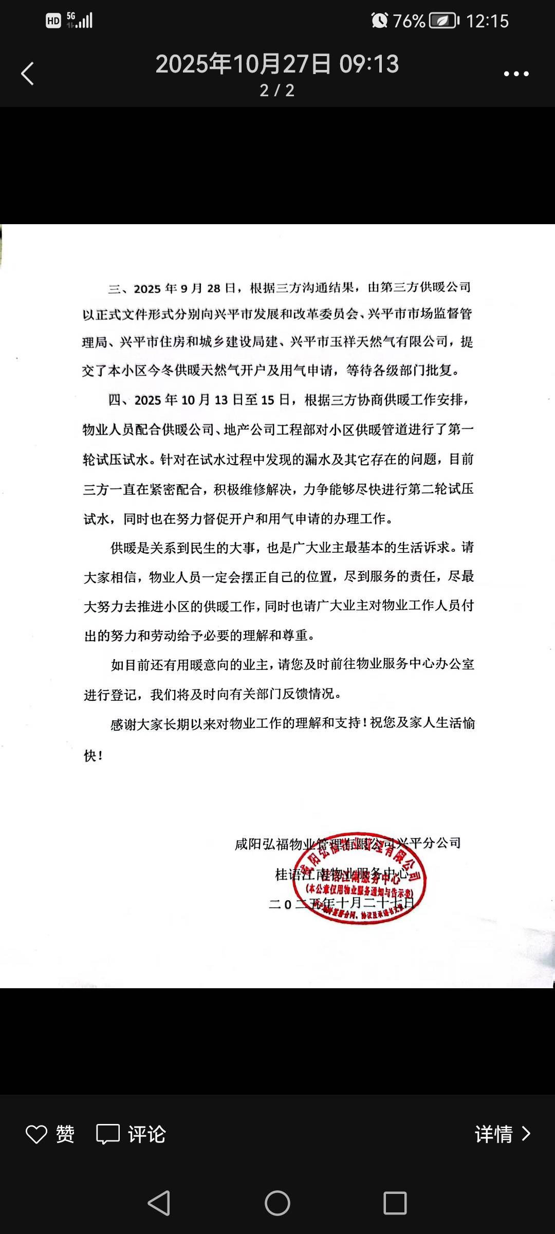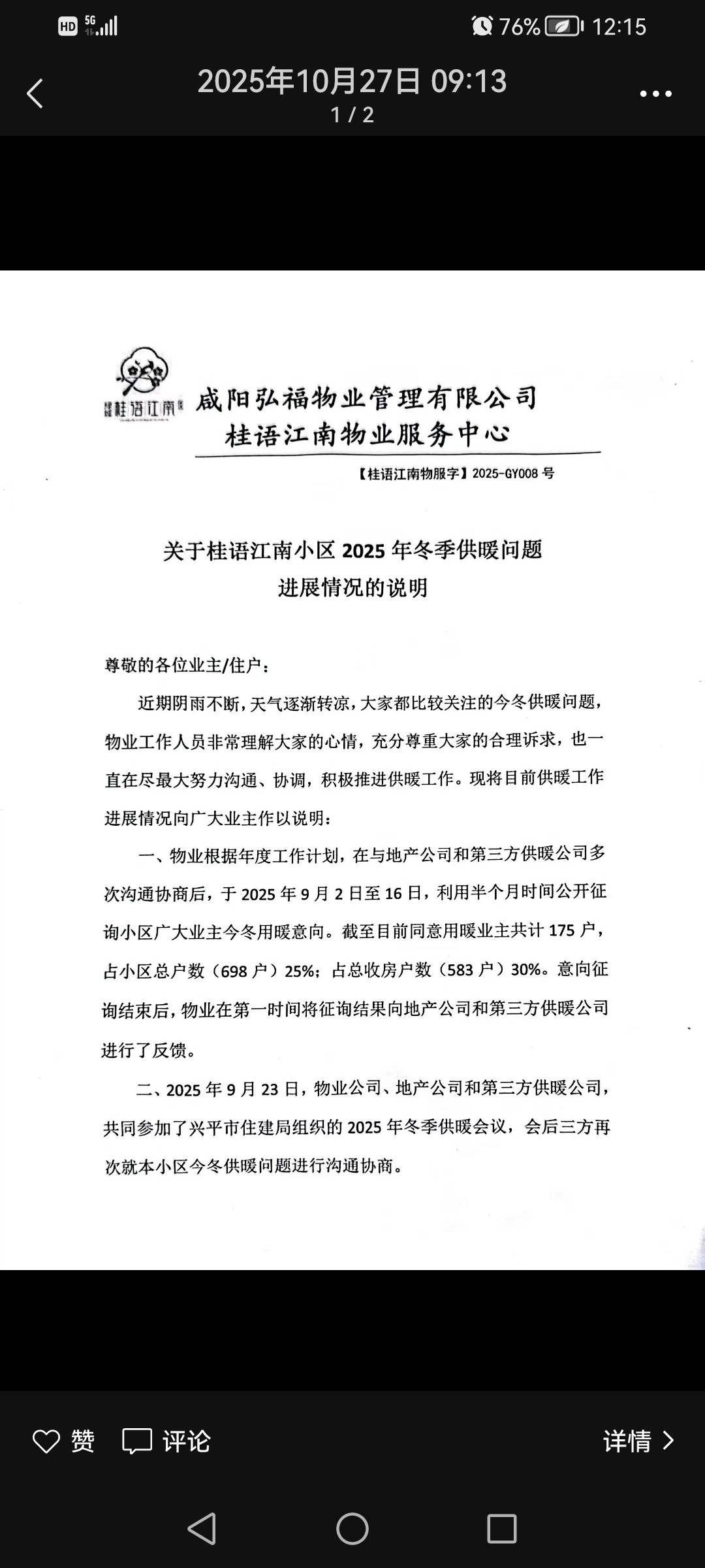 自2022年底交房至今,興平市綠城桂語江南小區(qū)仍未解決,剛開始開發(fā)商標準是地熱取暖,到最后變成小區(qū)自主供暖,合同上是第二個采暖季開始供暖,然而已經(jīng)三年了,去年因為住戶沒有達標,今年開始統(tǒng)計都達標了,物業(yè)就發(fā)了兩次文件,通知要打壓,至今已經(jīng)快一個月了沒有下文,也不知會業(yè)主,有的地方已經(jīng)開始供暖,而我們小區(qū)不知還要忍受多少個寒冬,物業(yè)開發(fā)商嚴重不作為,應該積極和業(yè)主一起協(xié)商解決。小區(qū)大多數(shù)都是老人小孩,希望有關(guān)部門盡快解決。