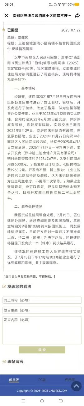 2025年7月,我向西部網(wǎng)反映了漢中旭三迪開發(fā)商不按購房合同圖紙交房并長期無償侵占業(yè)主商鋪。南鄭區(qū)住建局核查圖紙現(xiàn)場勘察后表示,待二審(終審)判決下達后,區(qū)住建局將督促開發(fā)商按二審判決執(zhí)行?,F(xiàn)在法院二審判決已經(jīng)下達,維持一審判決,但至今開發(fā)商仍未騰退,并在該商鋪內屋頂上修了第二層,在案涉商鋪內修了衛(wèi)生間。