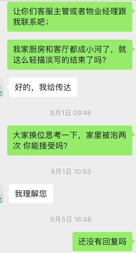 我是長安區(qū)櫻花二路雅居樂鉑瑯峯22號樓202的業(yè)主,家里因公共區(qū)域管道堵塞,從第一次4月11日到12月10日為止,四次反水,大便、各種污水蔓延到廚房、客廳、雜物間。我多次向物業(yè)管家反應(yīng),希望給一個解決方案,管家一直沒有給。想聯(lián)系物業(yè)經(jīng)理,管家也不給聯(lián)系方式。公共區(qū)域管道問題,物業(yè)有責(zé)任進行設(shè)備的維修維護,但是因物業(yè)經(jīng)理管理失職,導(dǎo)致我家受損嚴(yán)重,人也身心疲憊。希望相關(guān)部門關(guān)注能徹底解決反水問題。